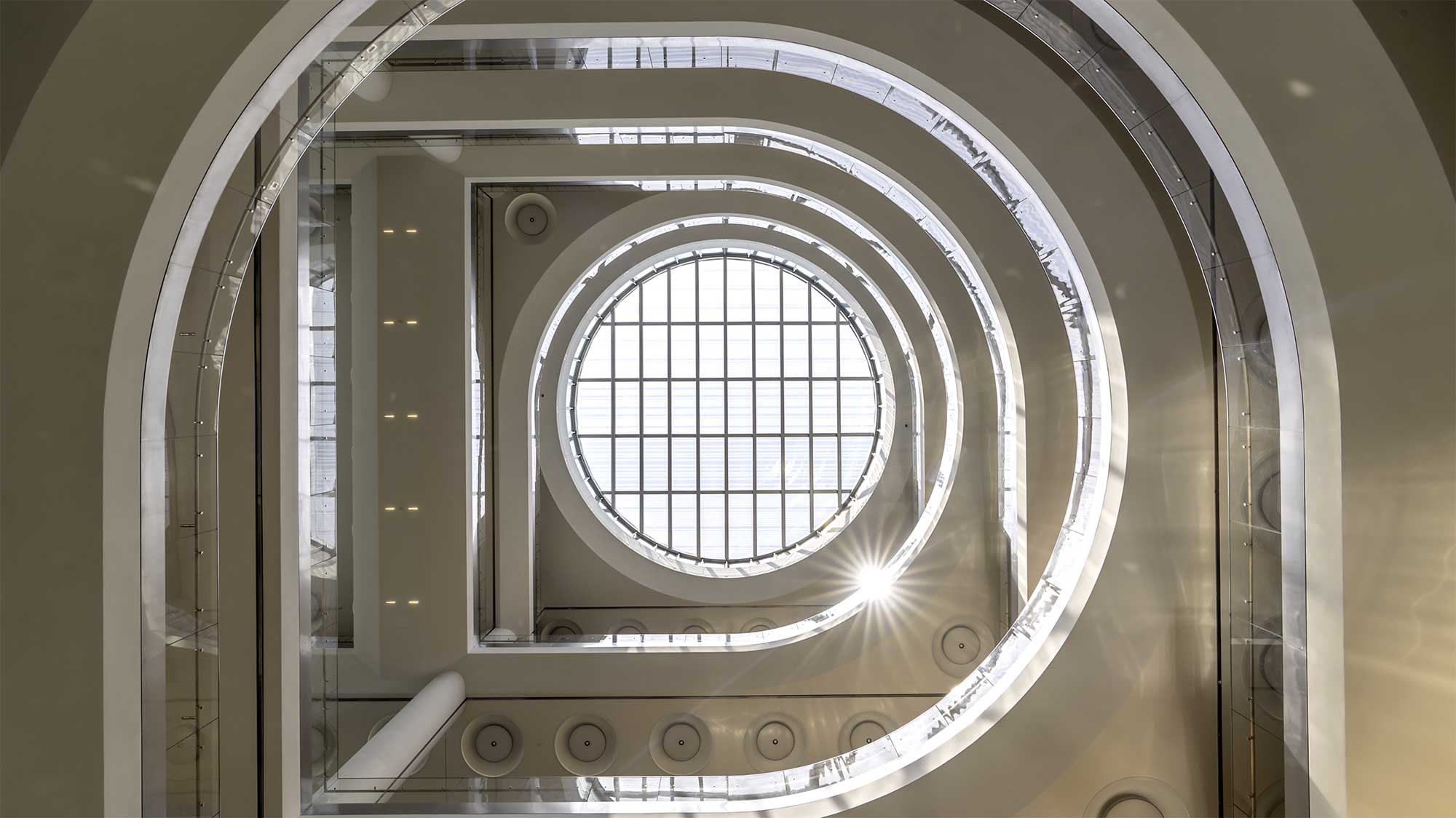 Office levels and atrium ceiling with sunlight and fixtures at Hankook HQ.