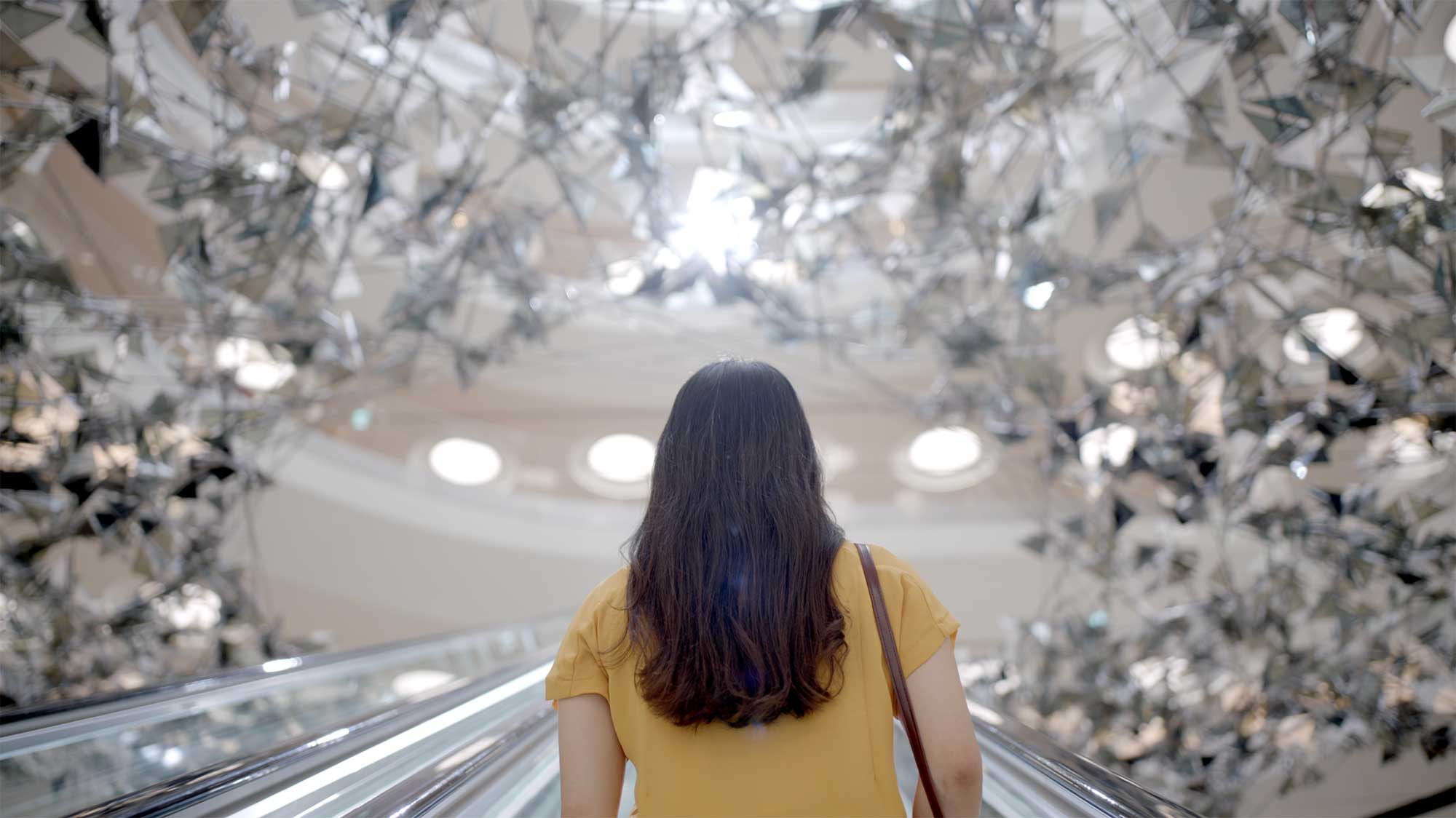 Hankook employee on escalator with mirrored glass art at HQ in Pangyo, Seoul.