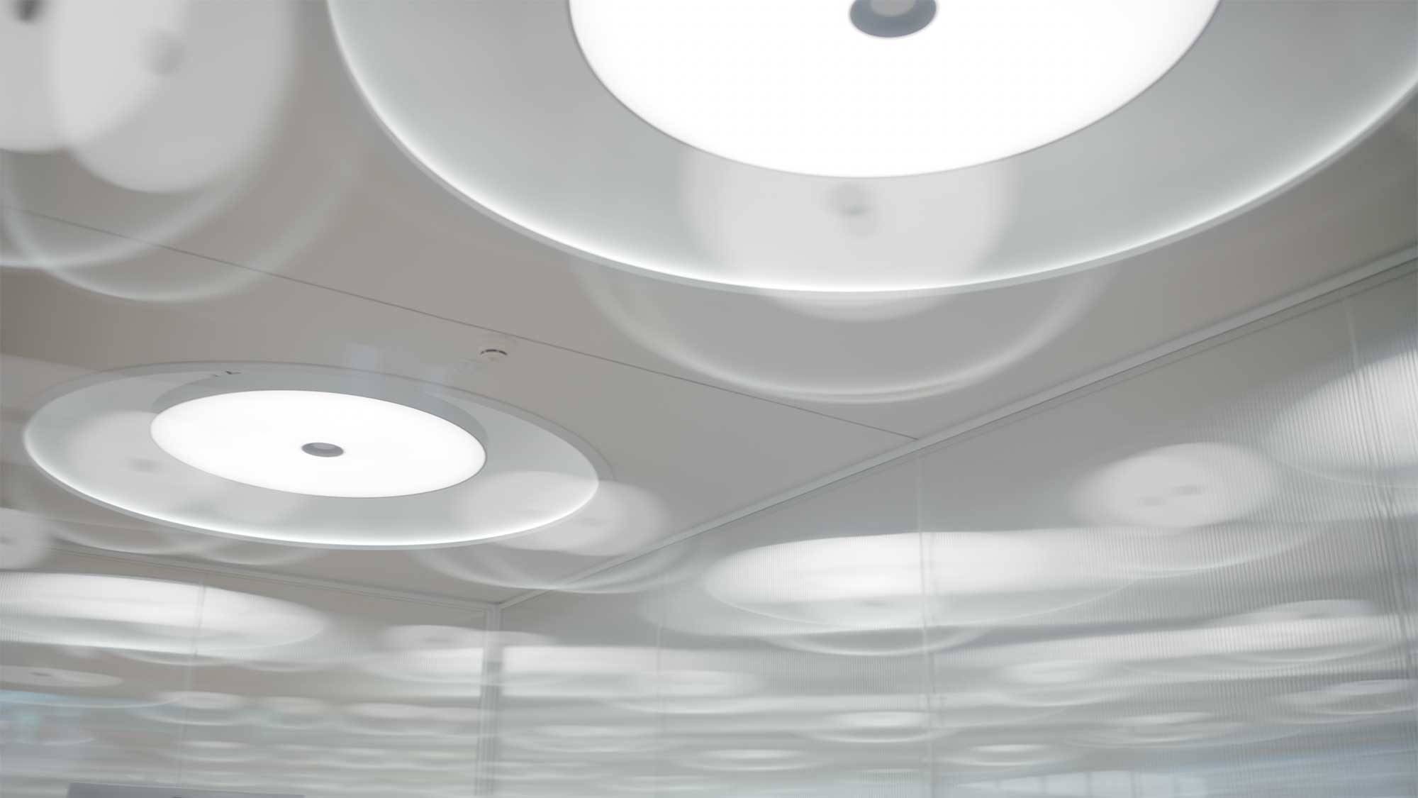 Round light fixtures reflect in glass at Hankook HQ in Pangyo, Seoul.