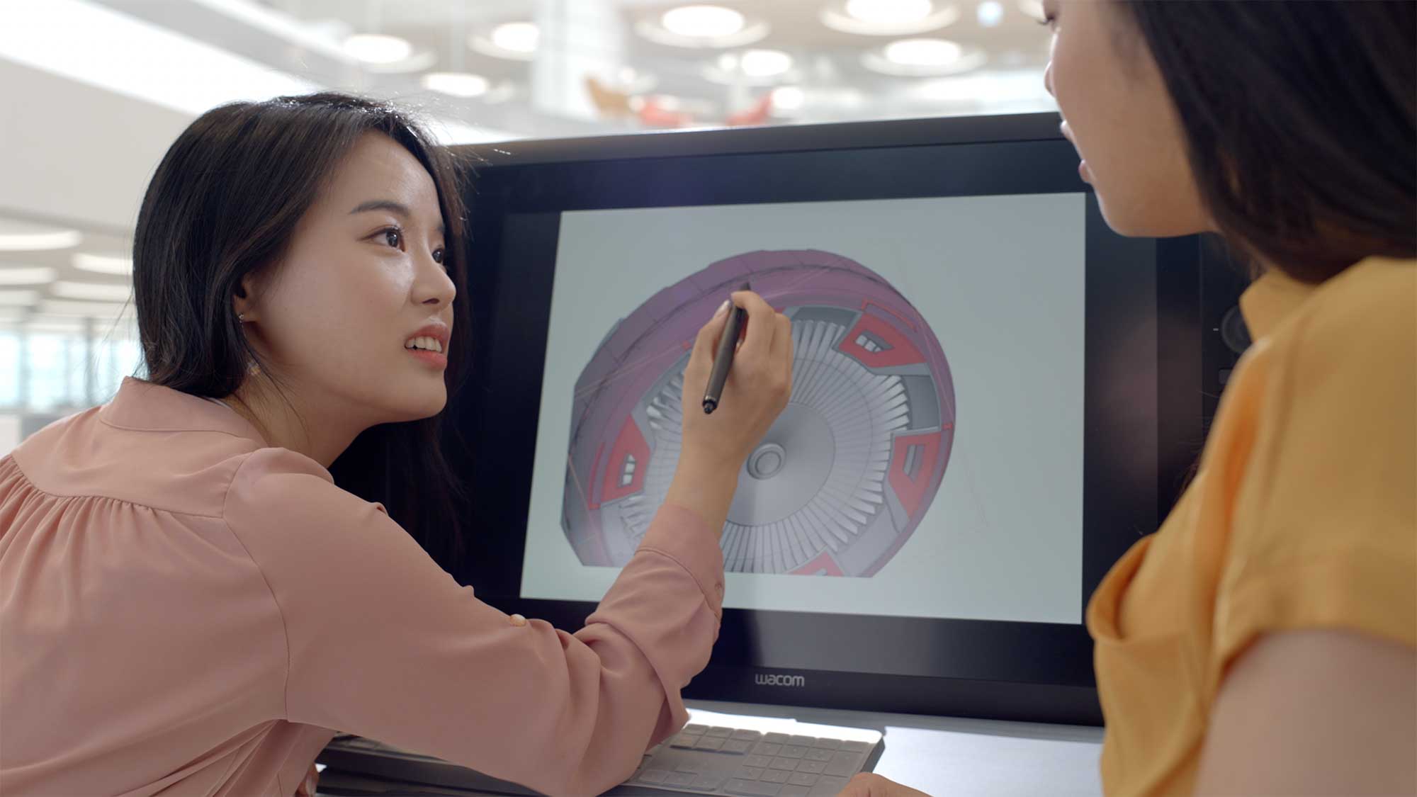 Two women sketch designs on digital tablet at Hankook HQ in Pangyo.