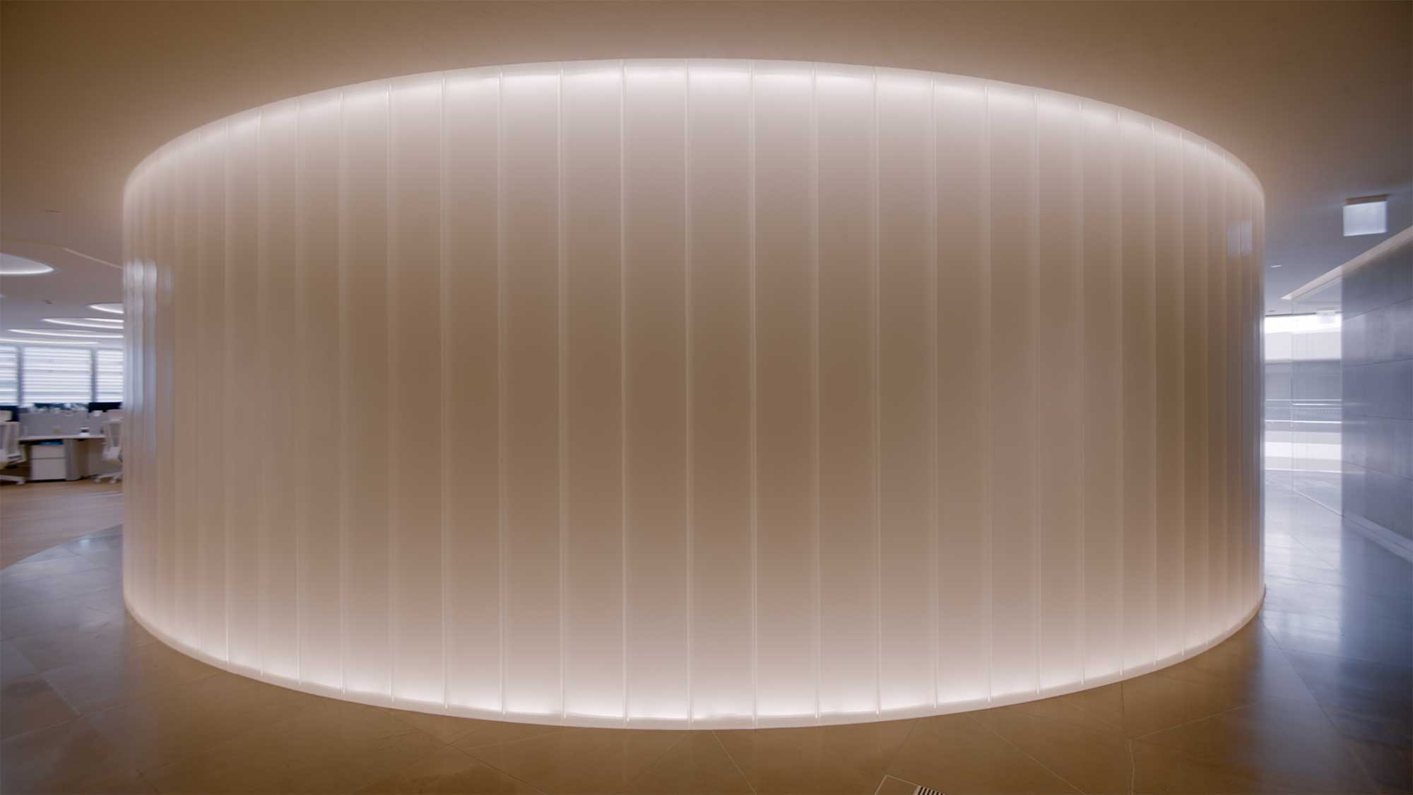 Cylindrical backlit wall surrounded by daylight at Hankook HQ in Pangyo.