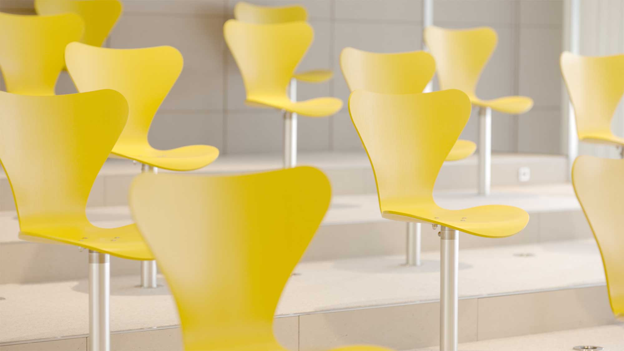 Yellow chairs in sleek minimalist auditorium at Hankook HQ in Pangyo.