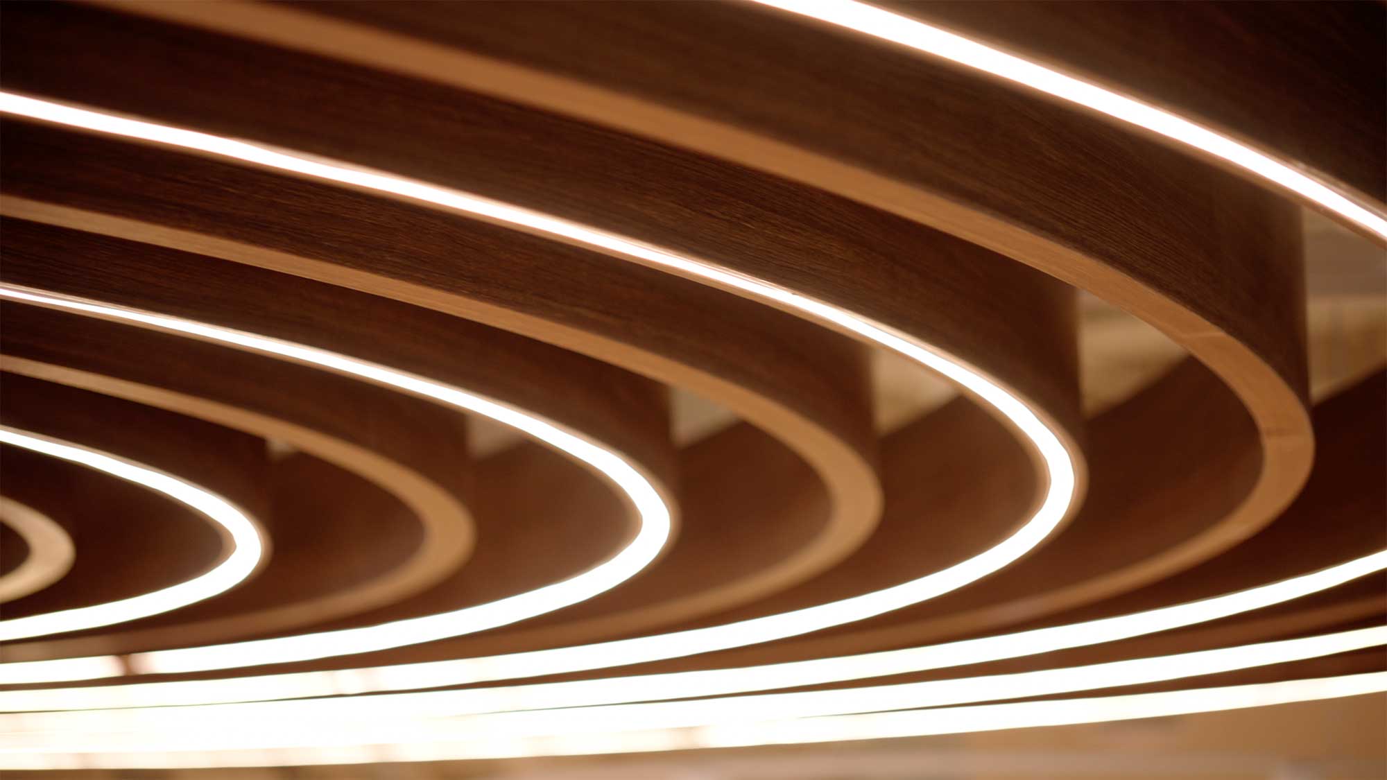 Wooden ceiling with curved slats and warm lights at Hankook HQ lobby.