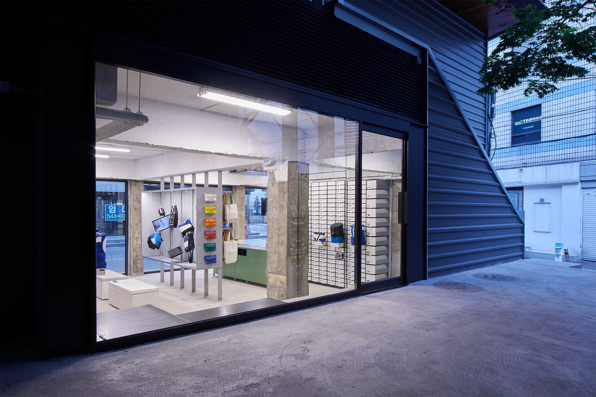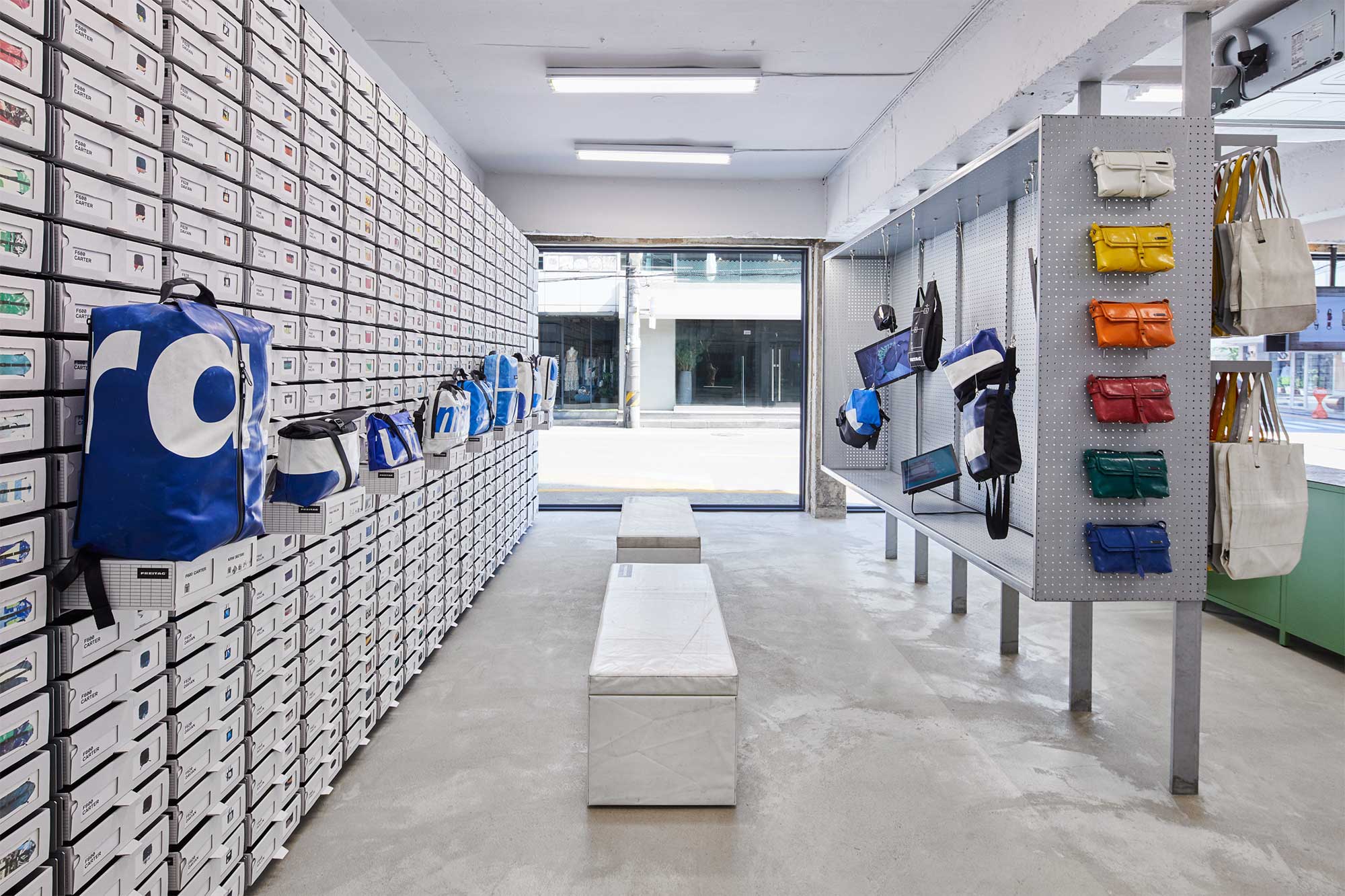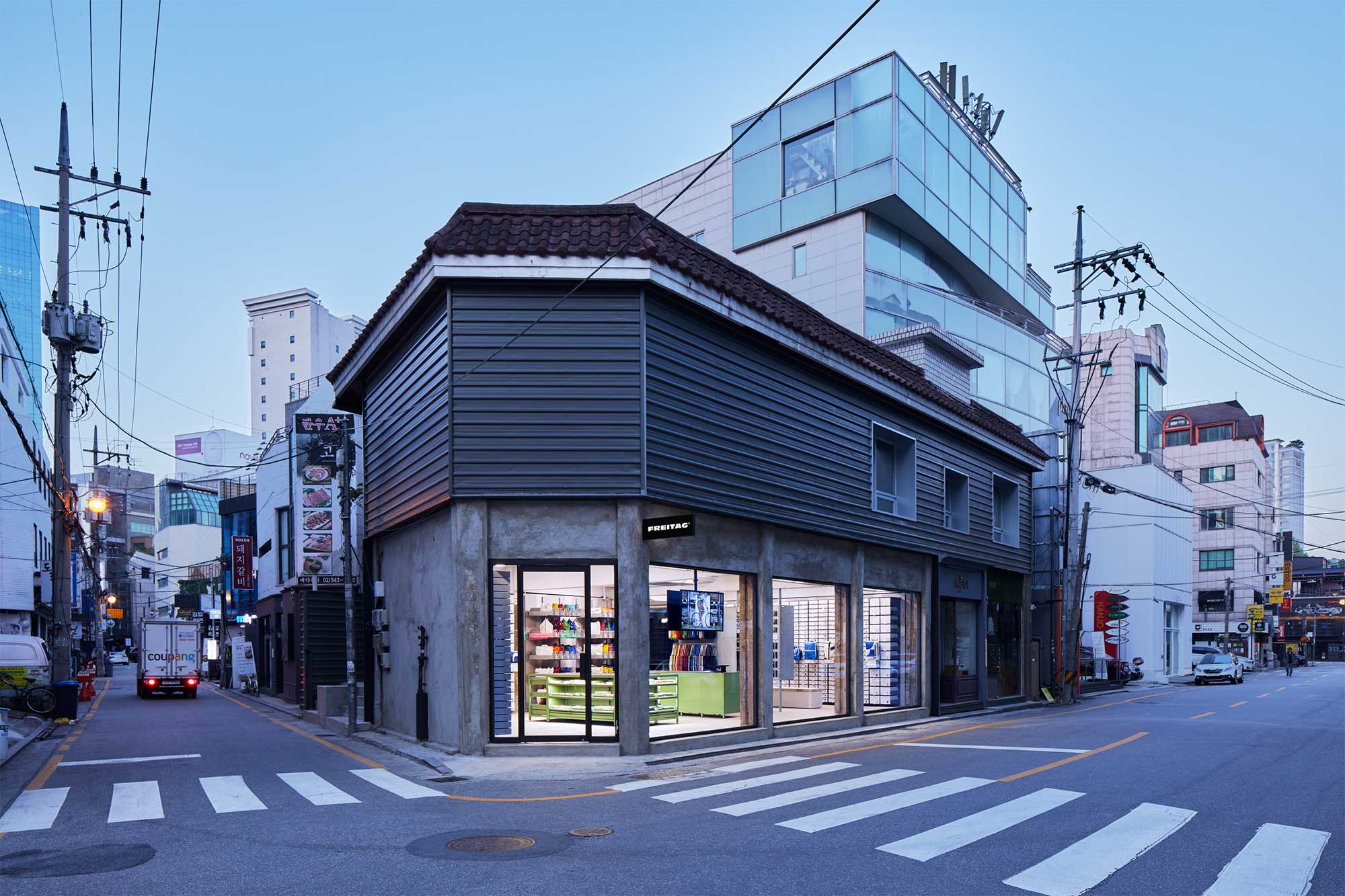 Freitag’s identity is rooted in reuse and transformation. The architectural language of the Apgujeong store mirrors that idea through industrial materials and practical detailing. The final image set presents the store as an urban retail environment shaped by material logic rather than decorative concept.
