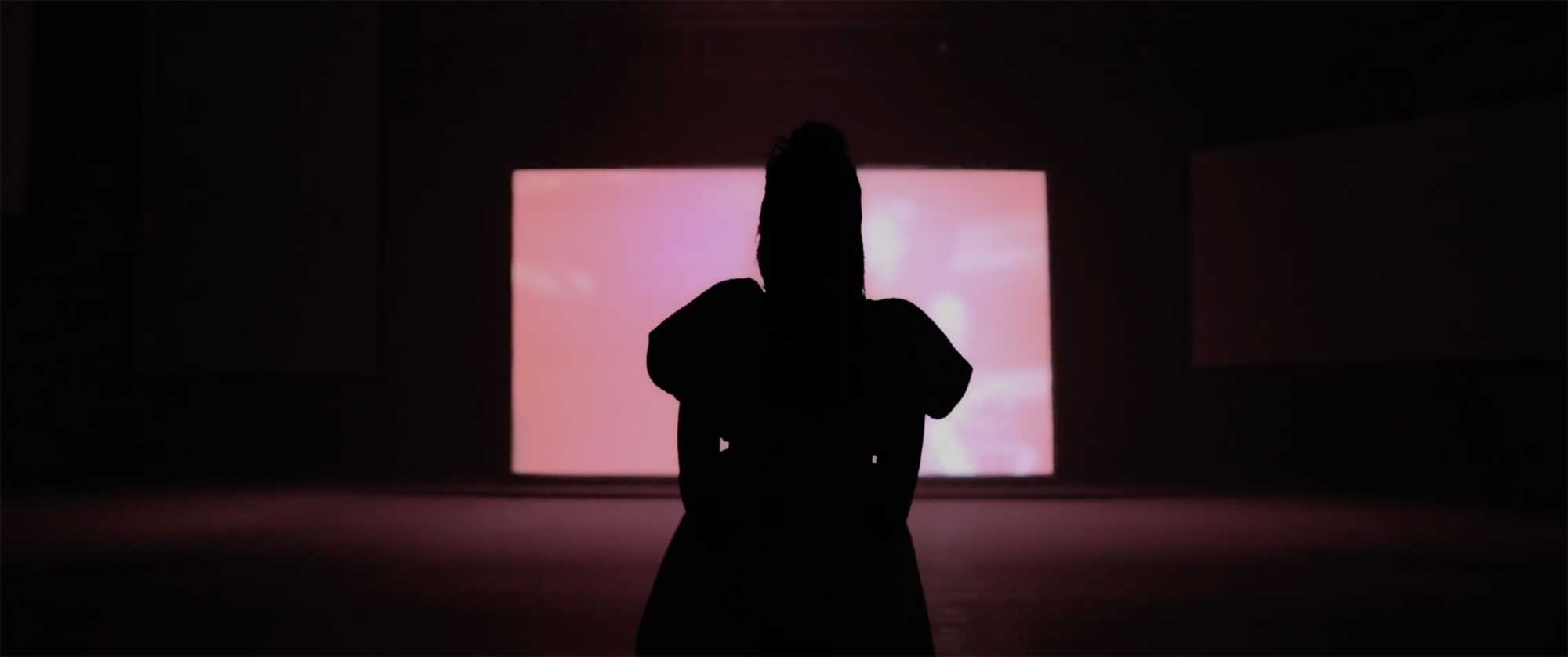 Silhouette of Jisoo in memory lane studio surrounded by screen projections.