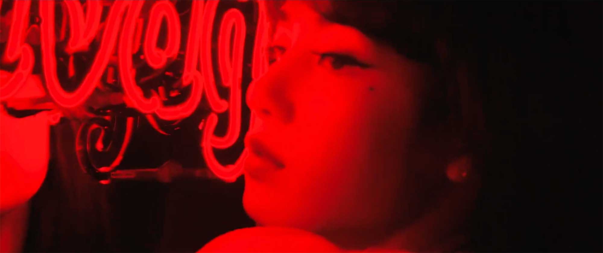 Close-up of Lisa lit by red neon in moody studio setup.