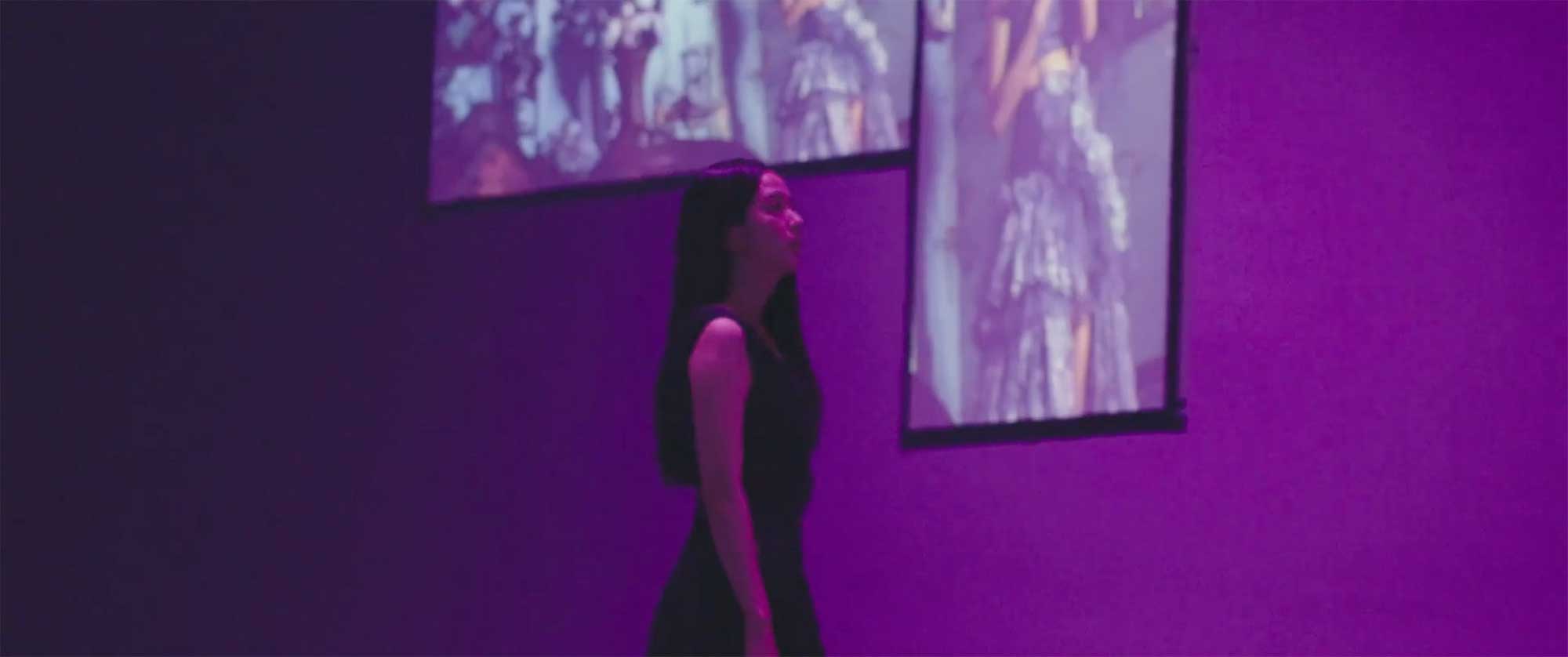 Jisoo walks through purple-lit memory lane with screen projections.