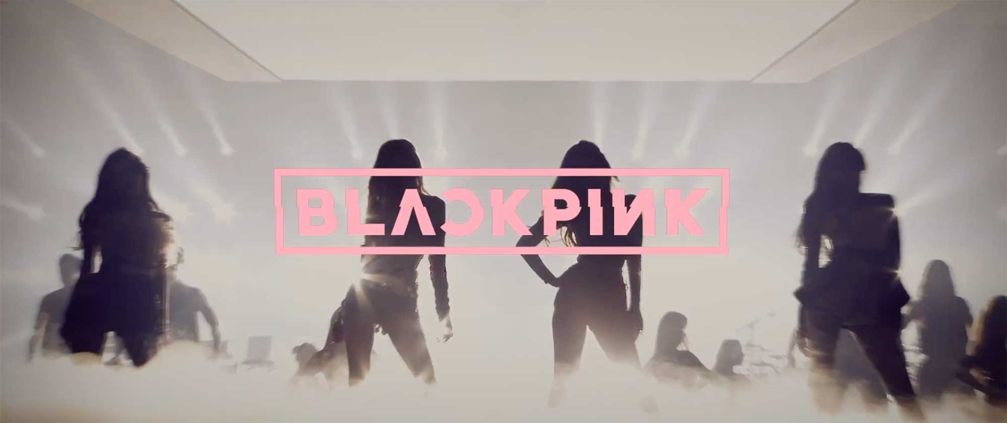 Blackpink silhouetted on stage with haze and logo overlay.