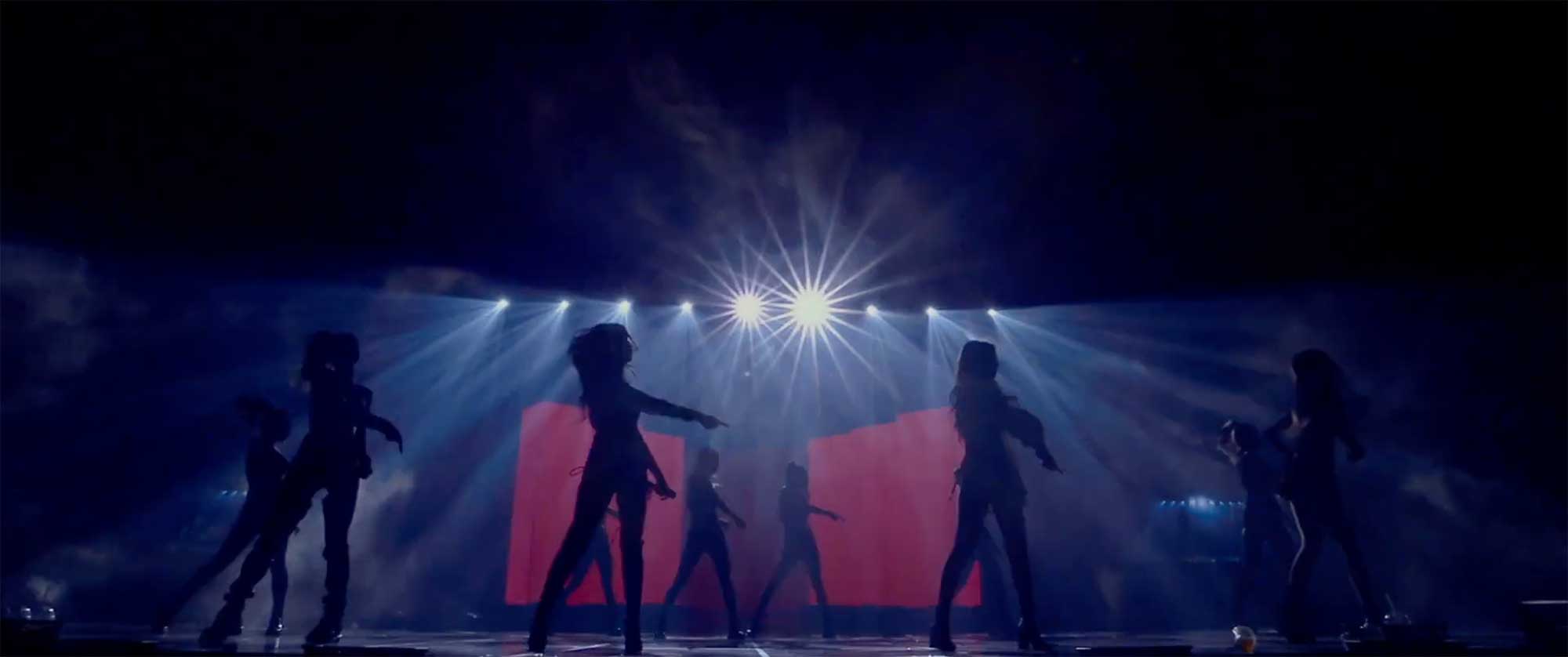 Blackpink and dancers perform under blue lights and haze.