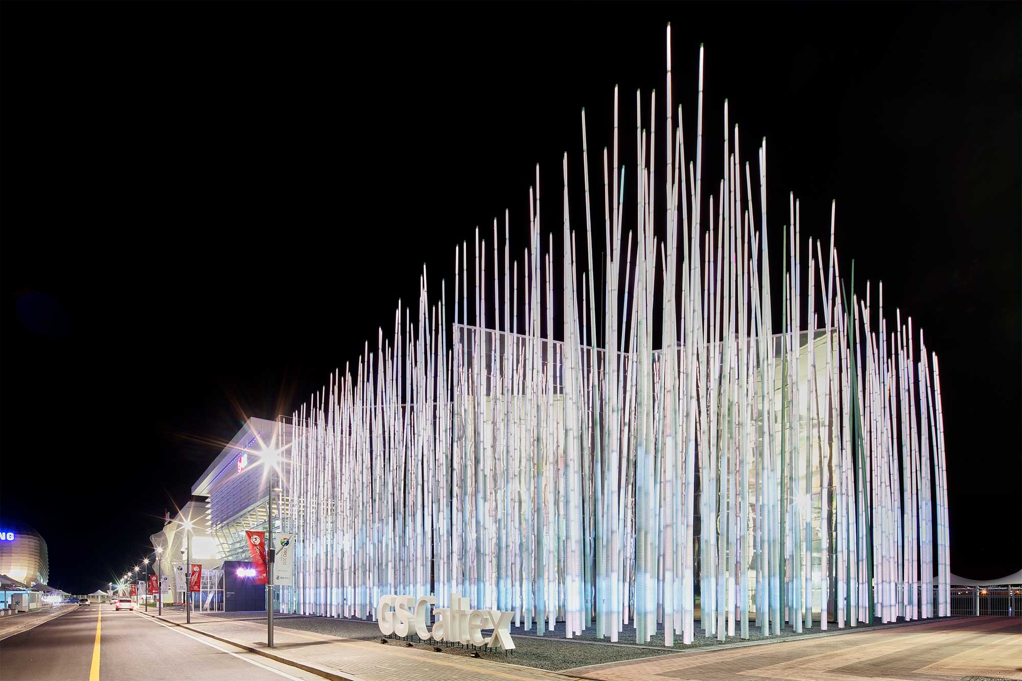 THE GERMAN ARCHITECTURE OFFICE ATELIER BRUECKNER COMMISSIONED ME AS A PHOTOGRAPHER TO DOCUMENT THEIR GS CALTEX PAVILION FOR THE WORLD EXHIBITION IN YEOSU, SOUTH KOREA. THE BUILDING IS SURROUNDED BY A FIELD OF METAL BLADES WITH INTERNAL LED LIGHTS THAT FLASH IN DIFFERENT COLORS AND PATTERNS, CREATING A STRONG VISUAL EFFECT.