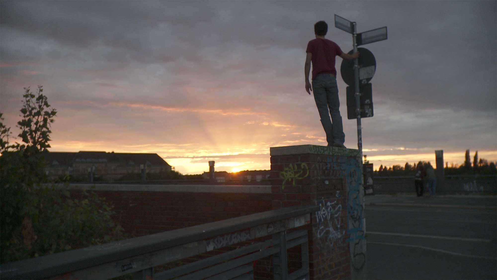 Crisjan Zollner stands on wall on street corner in Berlin as he looks at sunset