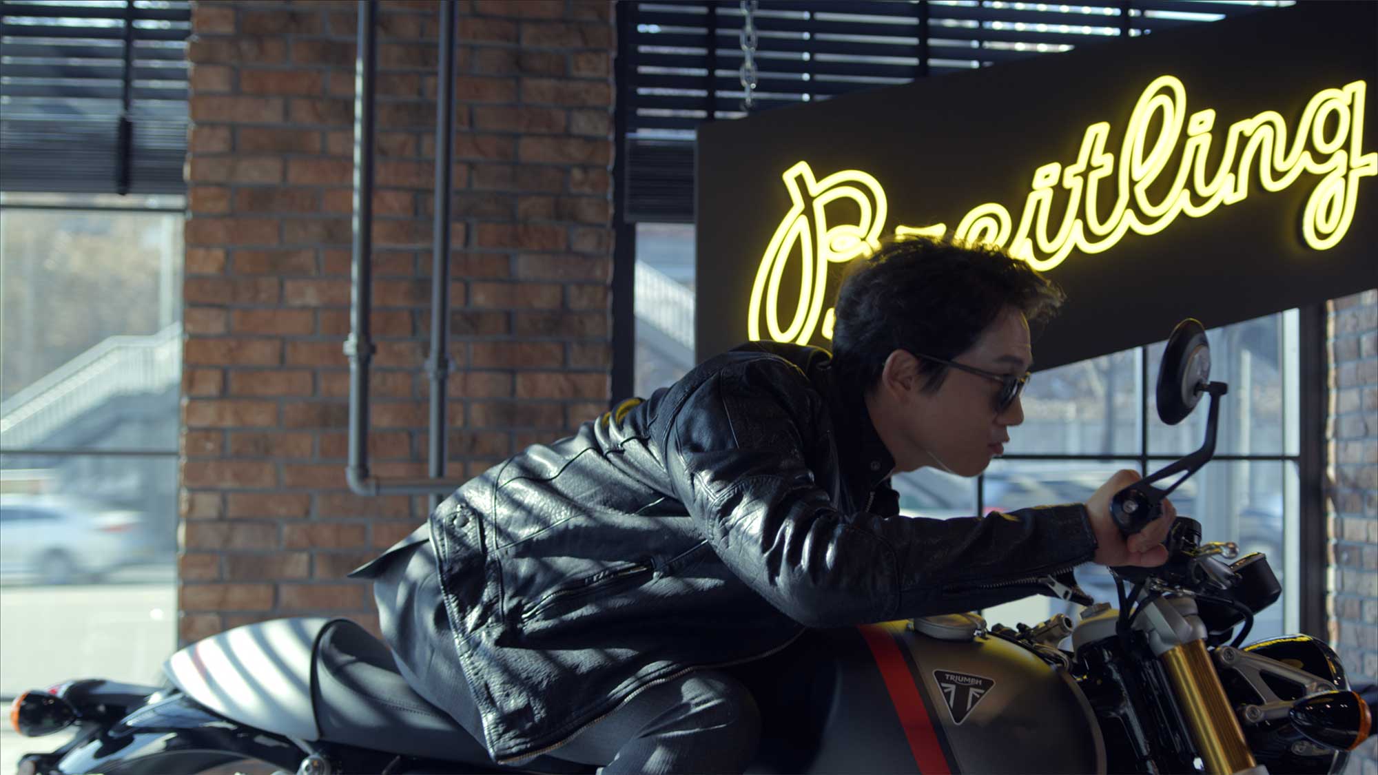 Ji Sung on Triumph motorcycle for Breitling promo in Seoul.