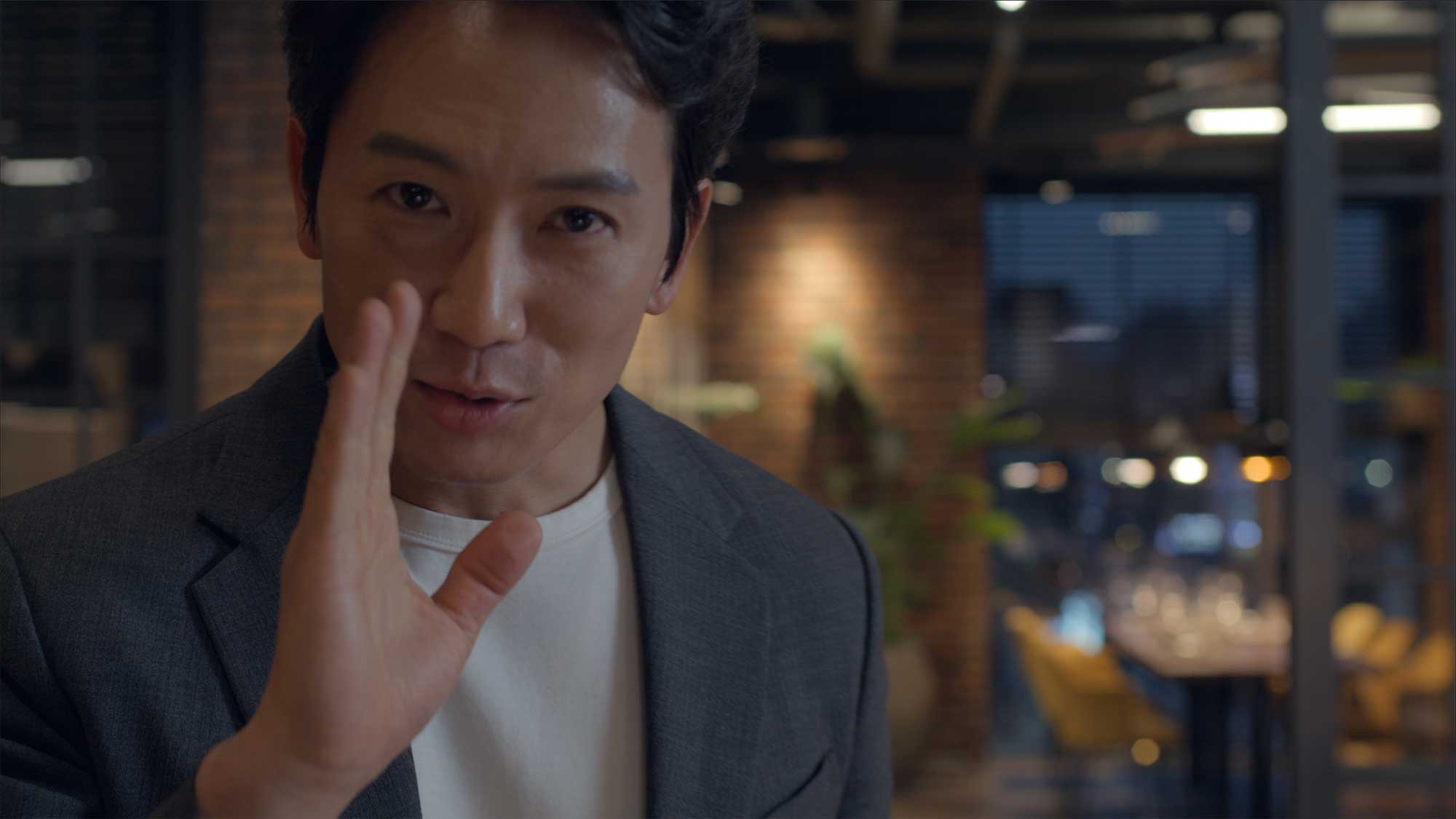 Ji Sung gesturing toward camera during Breitling shoot in Seoul.
