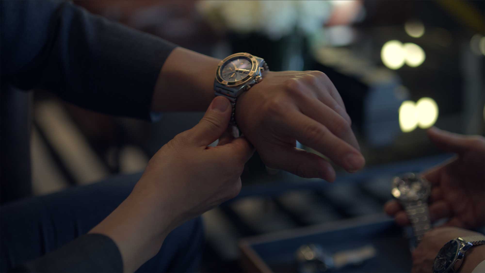 Close-up of Ji Sung adjusting Breitling watch.