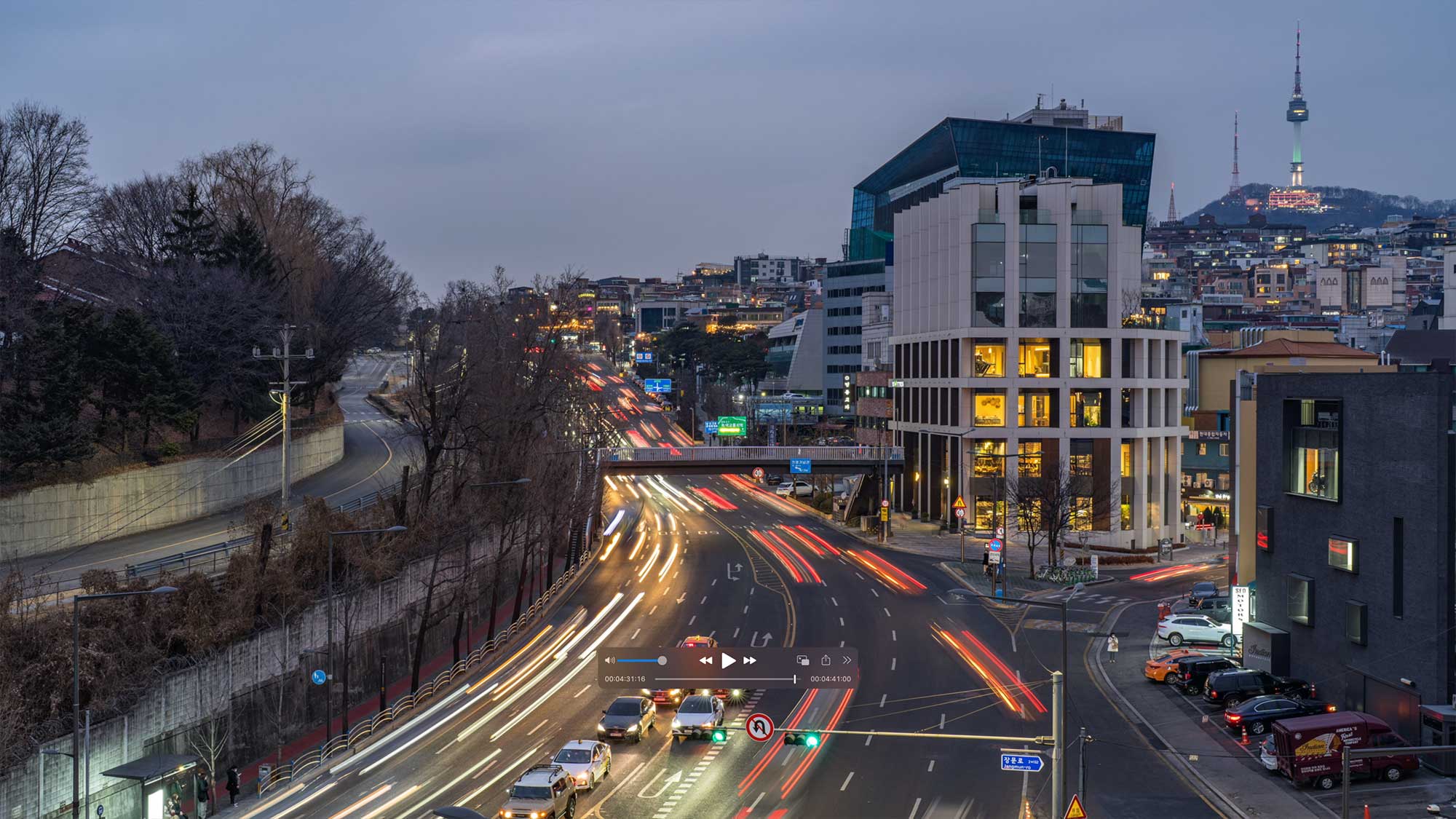Evening street view with lit-up Breitling Townhouse in Seoul.