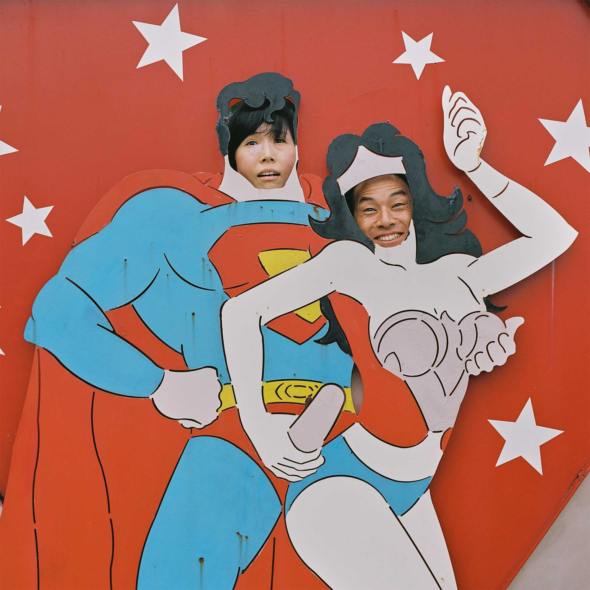 A middle-aged couple poses behind a Superman and Superwoman photo wall at Loveland sculpture park, Jejudo Island, South Korea
