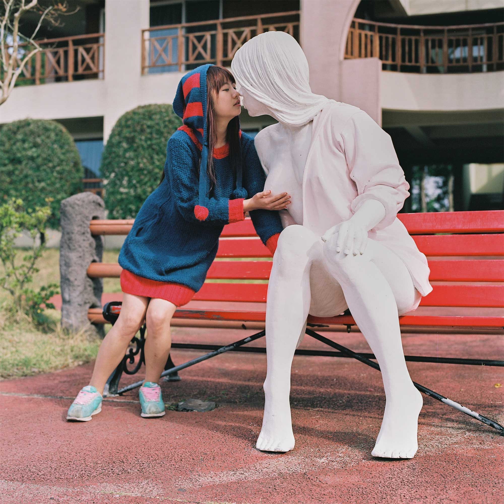 A girl sits next to a female sculpture on a bench and gives the sculpture a kiss at Loveland sculpture park, Jejudo Island, South Korea.