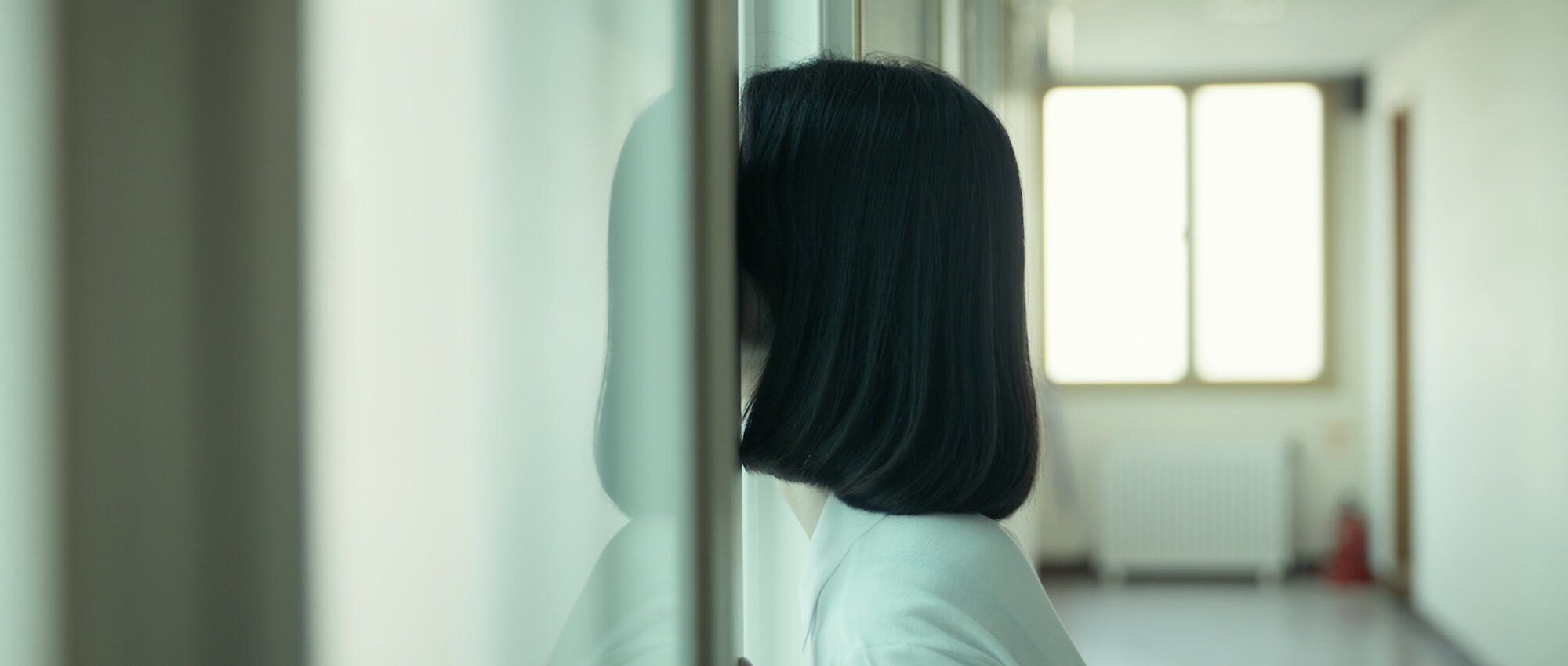 Hye Sun reflected in Hanawon glass hallway for Hana Korea