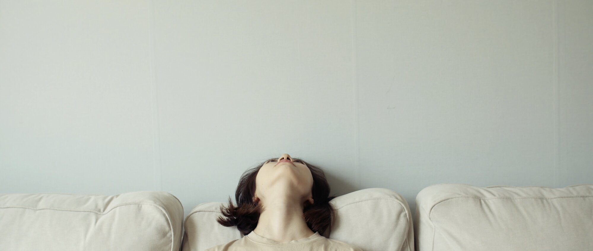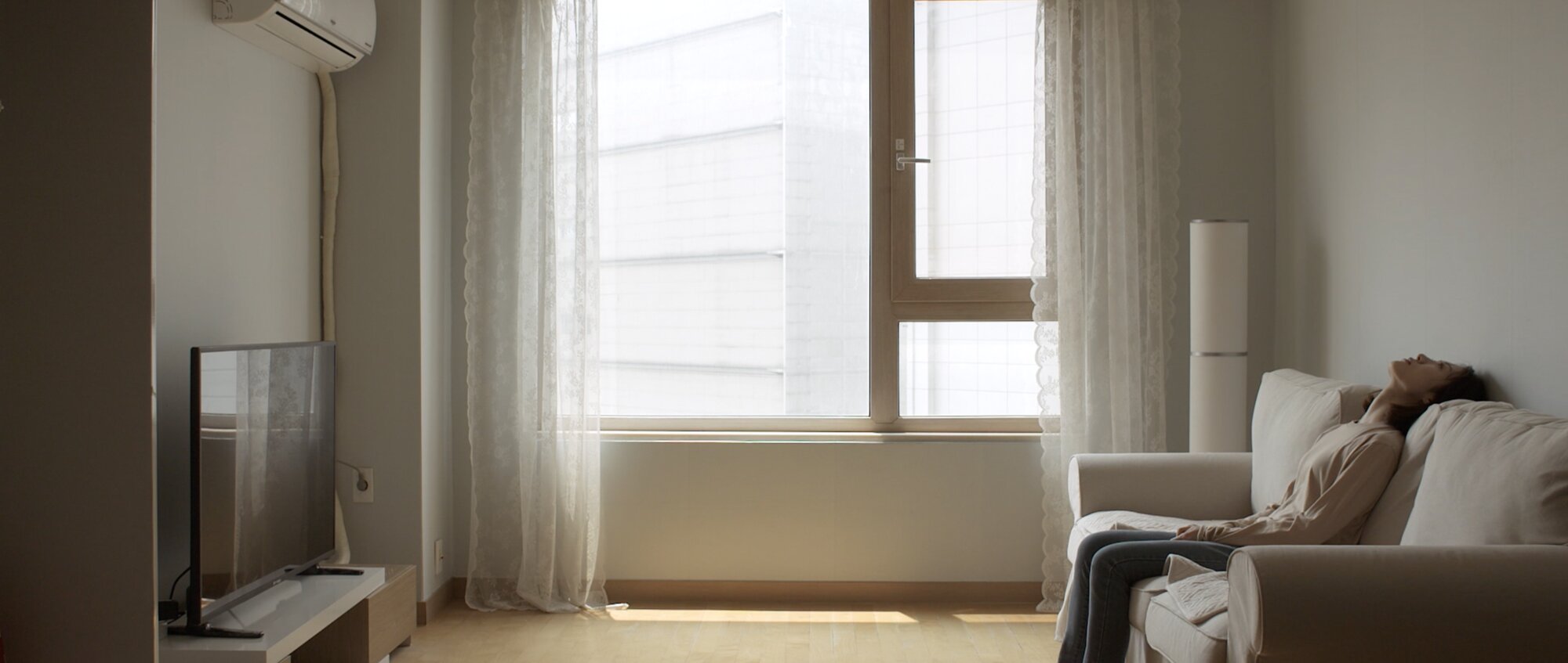 Close-up of Hye Sun resting on couch in Seoul apartment for Hana Korea