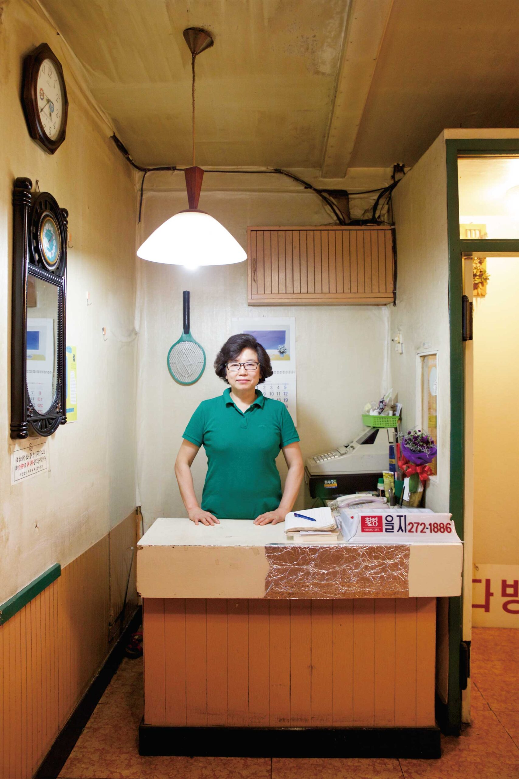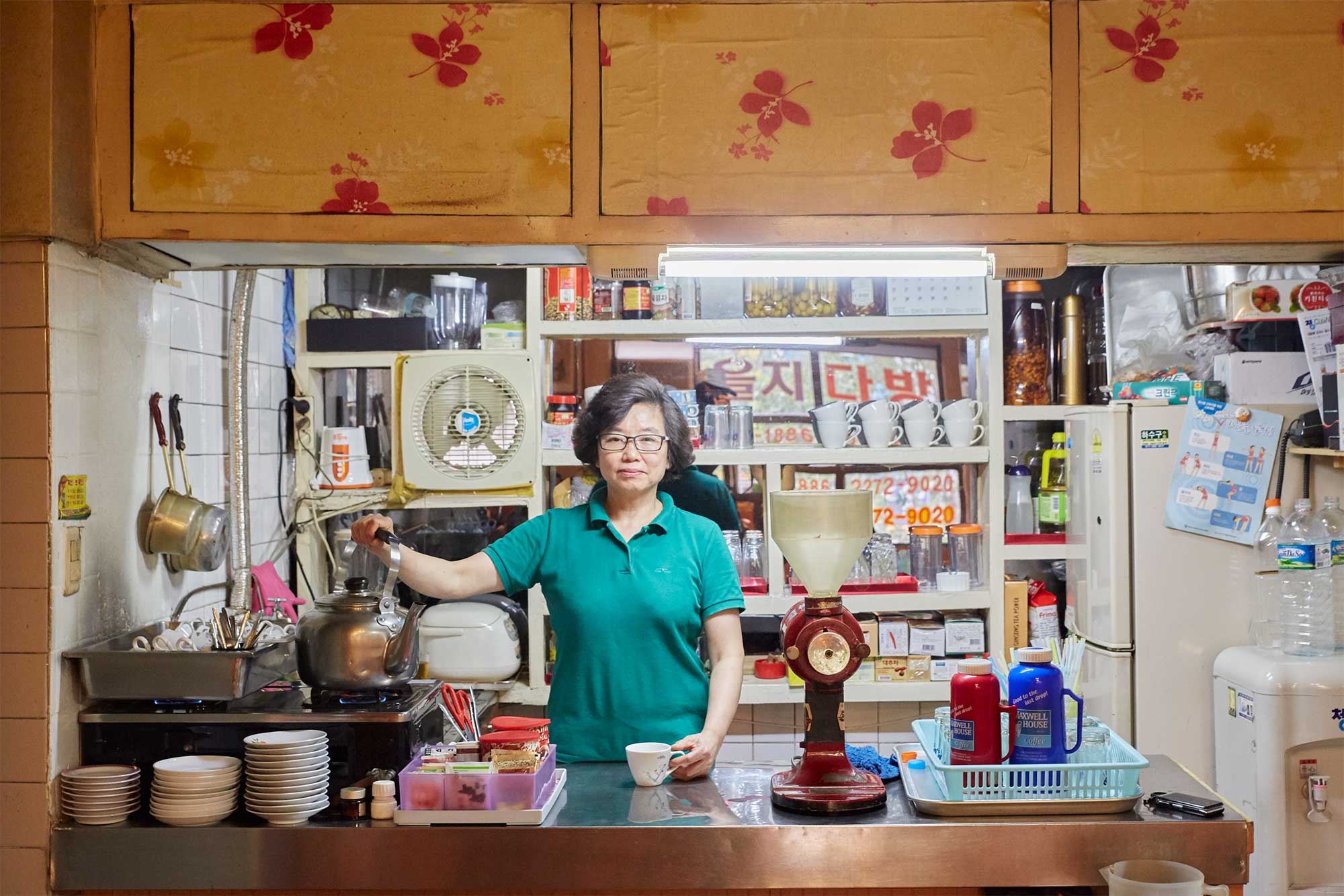 Portrait of the female owner standing behind the counter of a traditional Korean coffee shop in Seoul, captured for AS IT IS magazine’s issue on the beauty of aging.