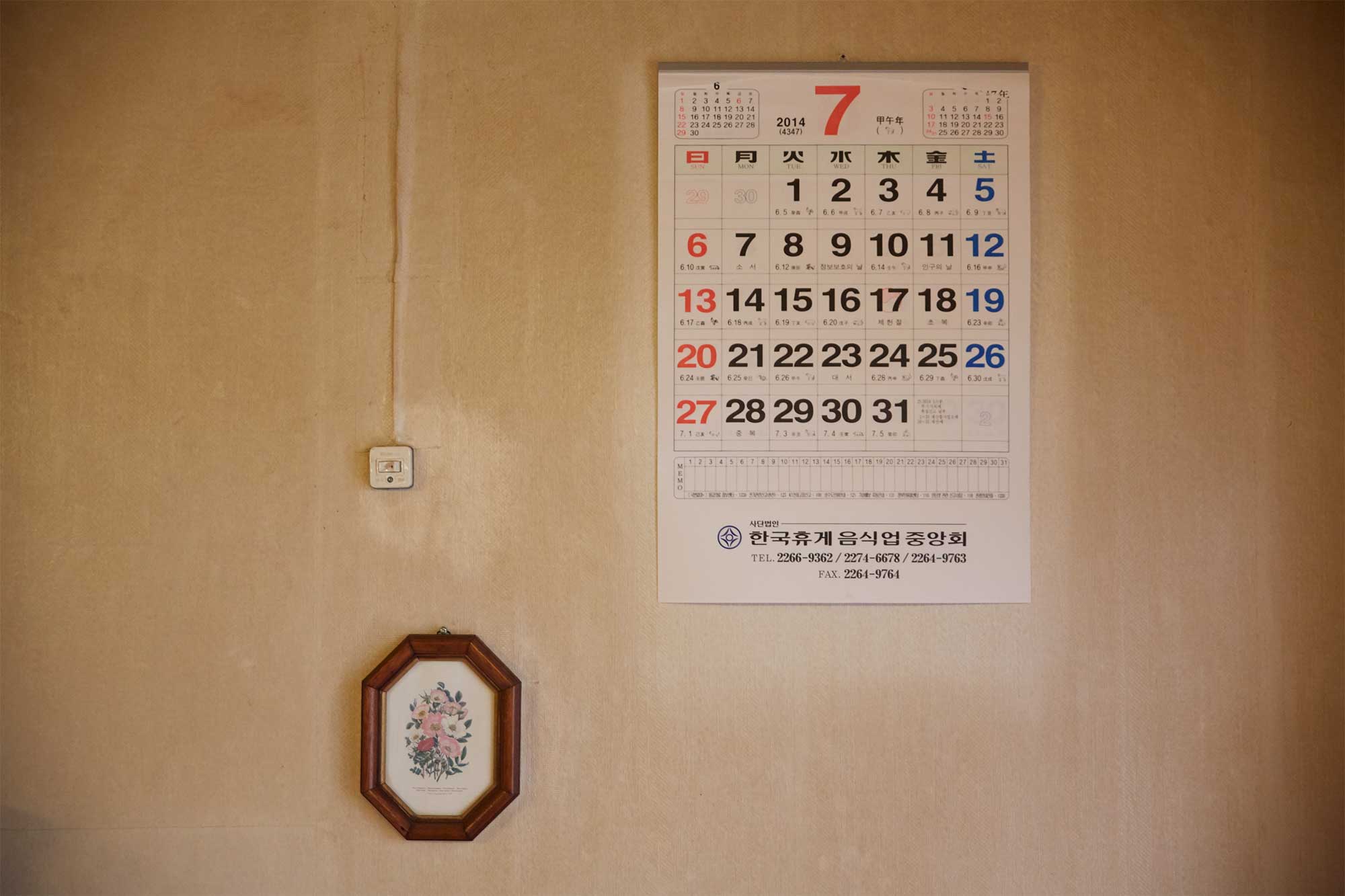 Insert shot of a yellowed wall with a calendar and framed wildflowers near a light switch in a traditional Seoul coffee shop, featured in AS IT IS magazine’s issue on the beauty of aging.