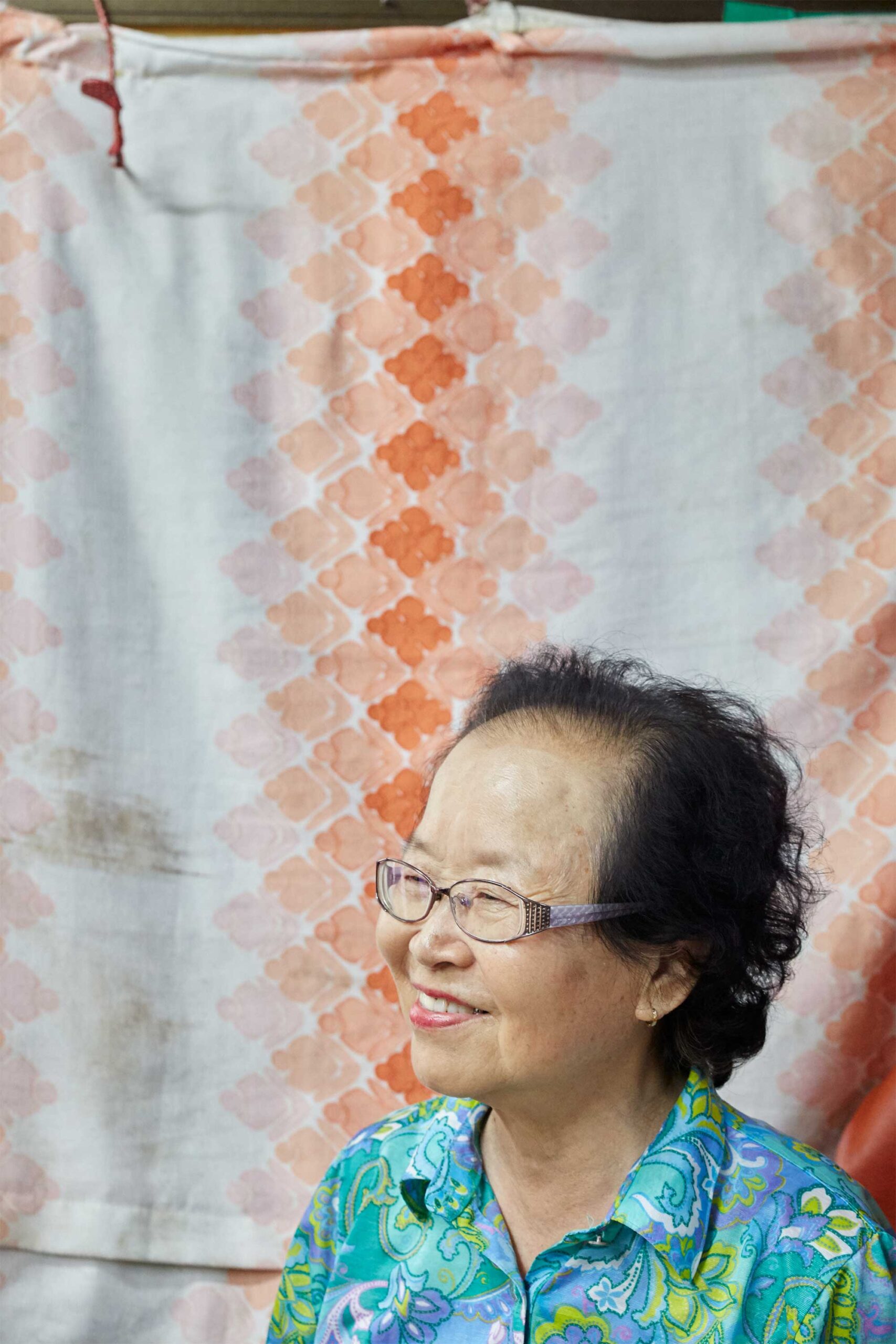 Portrait of the older female owner set against a beautifully patterned cloth draping a shelf in her Seoul hairdressing salon, featured in AS IT IS magazine's issue on the beauty of aging.