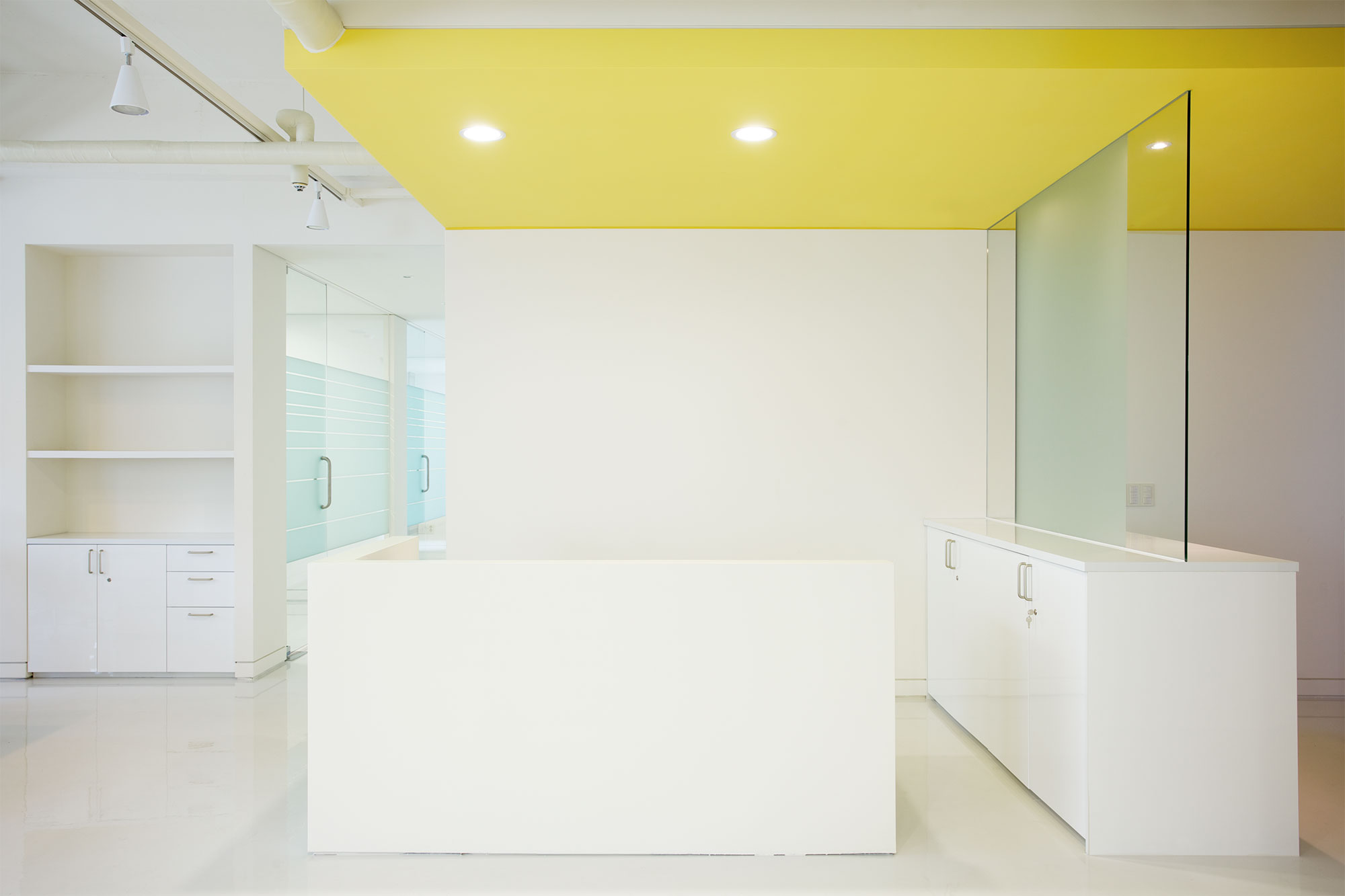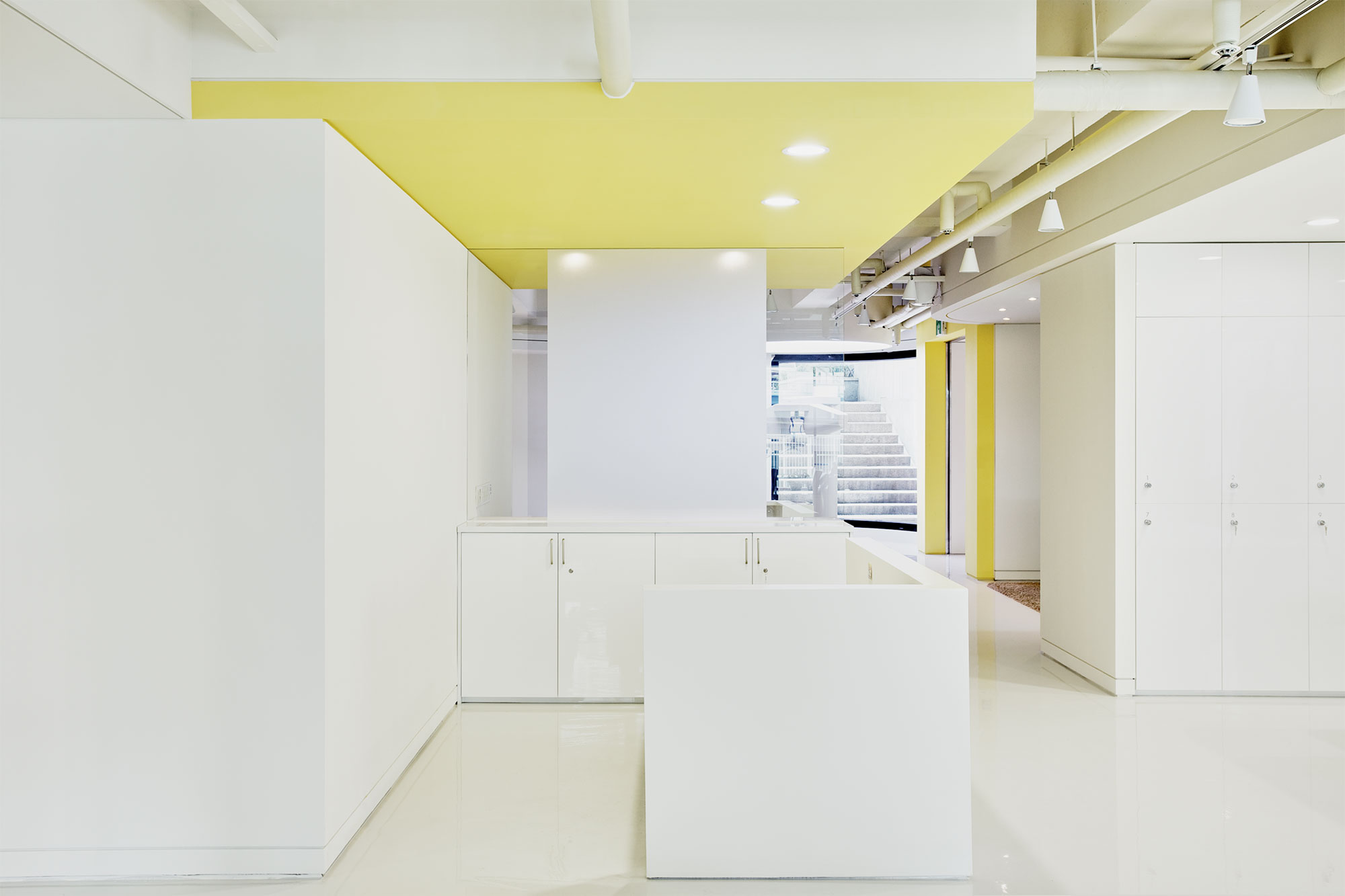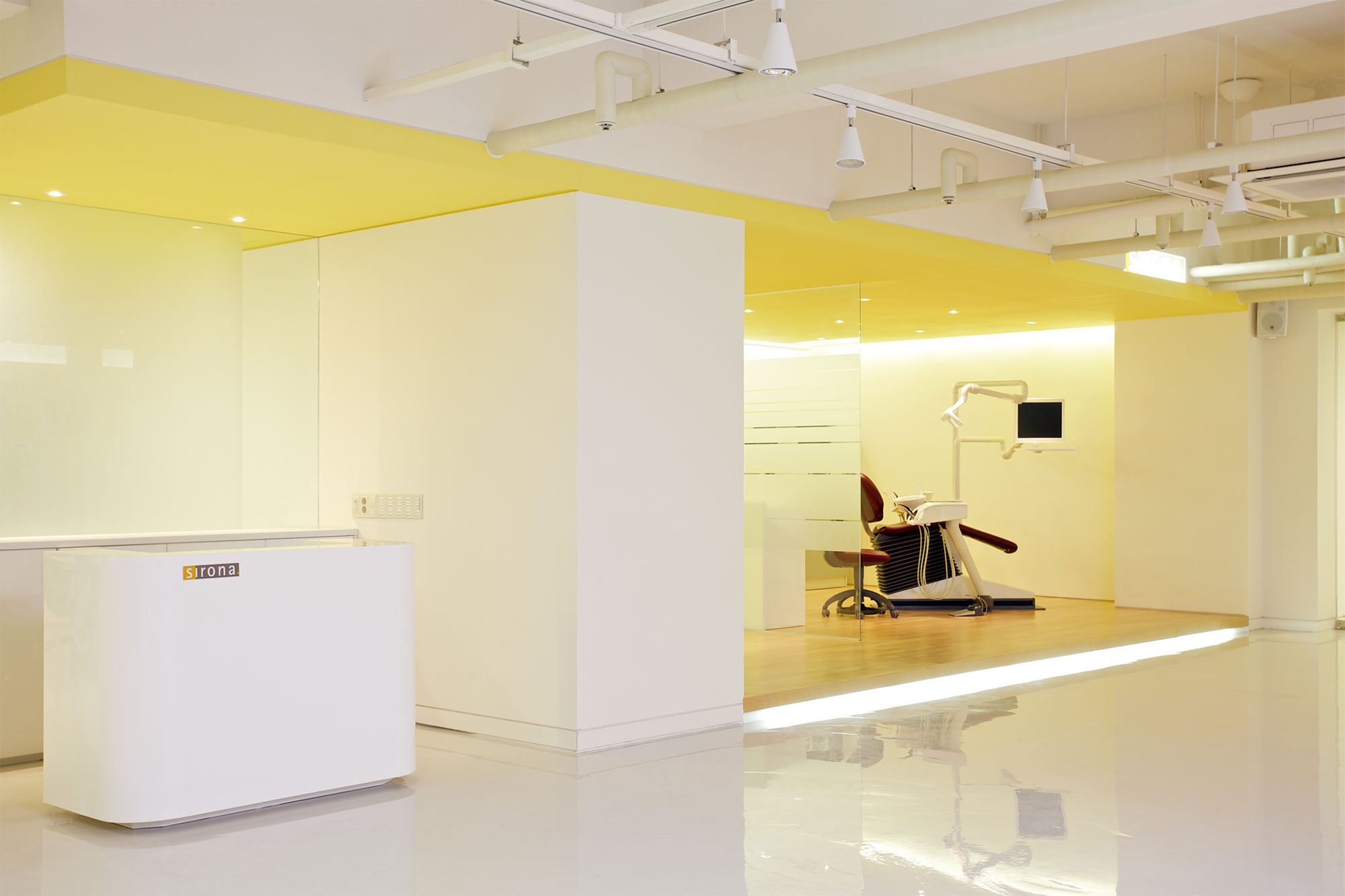 SIRONA IS A PRODUCER OF DENTAL EQUIPMENT. THE DESIGN OF THE SHOWROOM FOCUSES MOST IMPORTANTLY ON THE SIMPLICITY AND FUNCTIONALITY OF THE SPACE WHICH SUITS THE GERMAN ORIGIN OF THE CLIENT. THE GENERAL SPACE ORGANIZATION IS SPLIT BETWEEN THE MORE PRIVATE OFFICE SPACES AND THE PUBLIC SHOW ROOM. THE SHOW ROOM INCLUDES SEMINAR SPACES, MEETING ROOMS AND AREAS TO DISPLAY THE LATEST PRODUCTS. THERE IS A LOUNGE WHERE VISITOR CAN COMFORTABLY WAIT NEAR THE ENTRY. WORKS BY FLOH, A GERMAN GRAFFITI ARTIST WHICH ZABEL & PARTNER SELECTED, ARE DECORATING THE WALL IN THE LOUNGE. THE COLOUR CONCEPT IS VERY REDUCED AND DOMINATED BY WHITE. SPLASHES OF YELLOW, THE SIGNATURE COLOUR OF SIRONA, ARE BEING USED TO EMPHASIZE ON SPECIAL DESIGN OR SHOW ROOM FEATURES.
