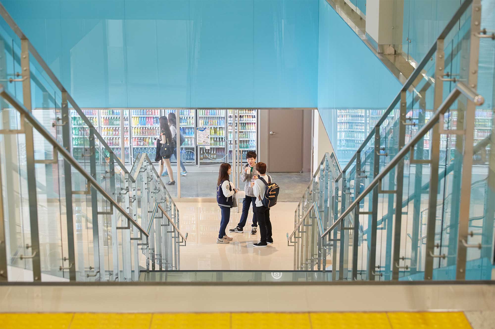 A small group of Underwood International College students gathers near an interior staircase by a campus convenience store at Yonsei University, Seoul, South Korea.