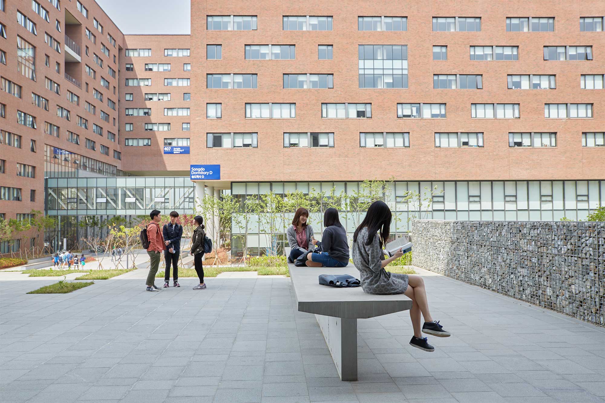 Smaller groups of Underwood International College students relax in an outdoor rest area featuring a long bench on the Songdo campus of Yonsei University, Seoul, South Korea.