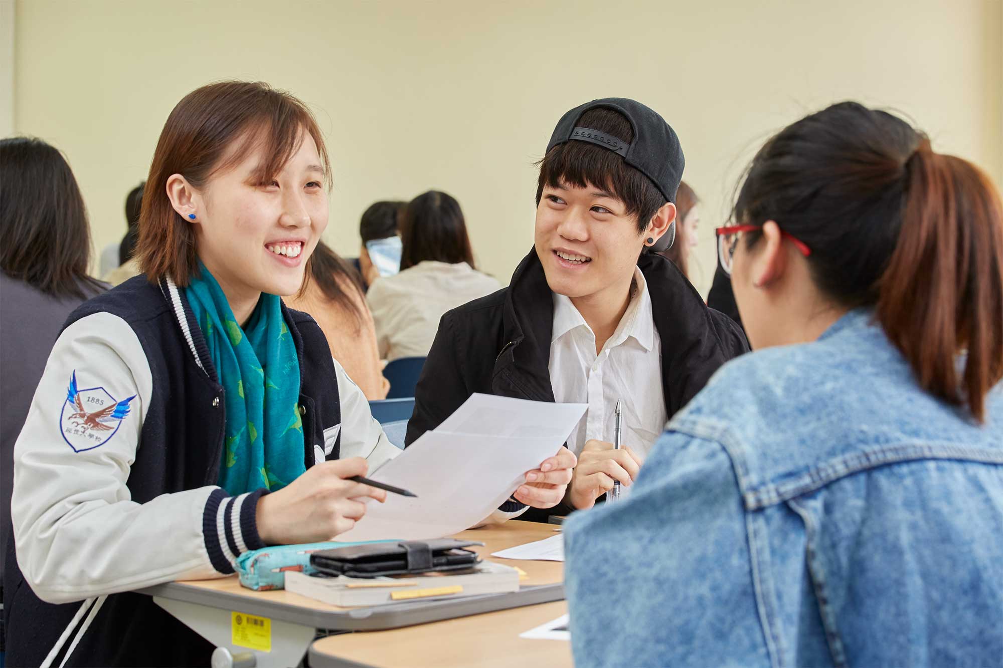 A group of Underwood International College students collaborates on a presentation in a classroom at Sinchon campus, Yonsei University, Seoul, South Korea.
