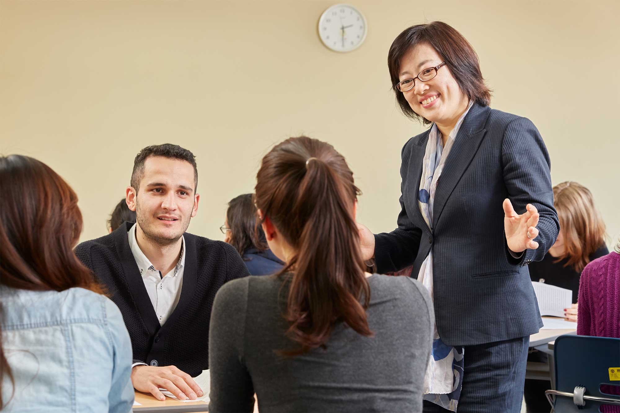 A group of Underwood International College students discusses their presentation with the dean in a classroom at Sinchon campus, Yonsei University, Seoul, South Korea.