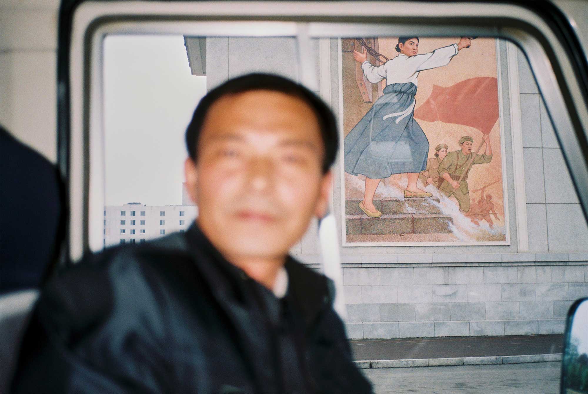 The tour guide in Pyongyang, North Korea, relaxes in the shotgun seat of the tour bus, enjoying a smoke