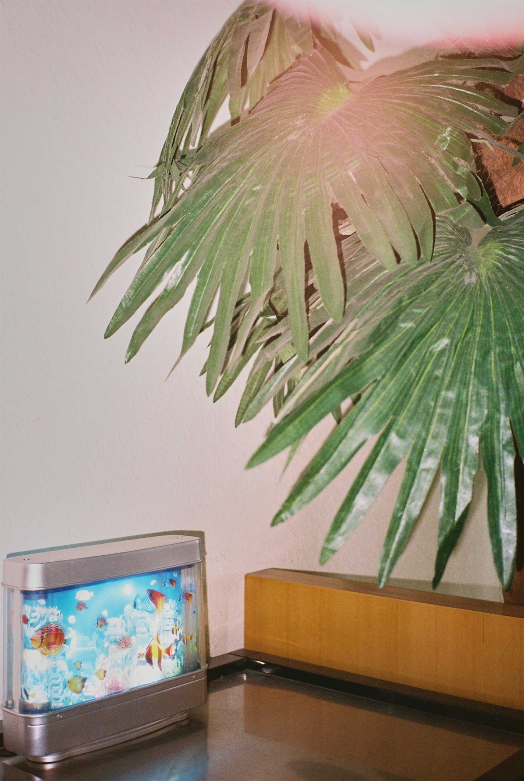 Interior corner in Pyongyang, North Korea, with a plant reaching over a small fake aquarium filled with plastic fish