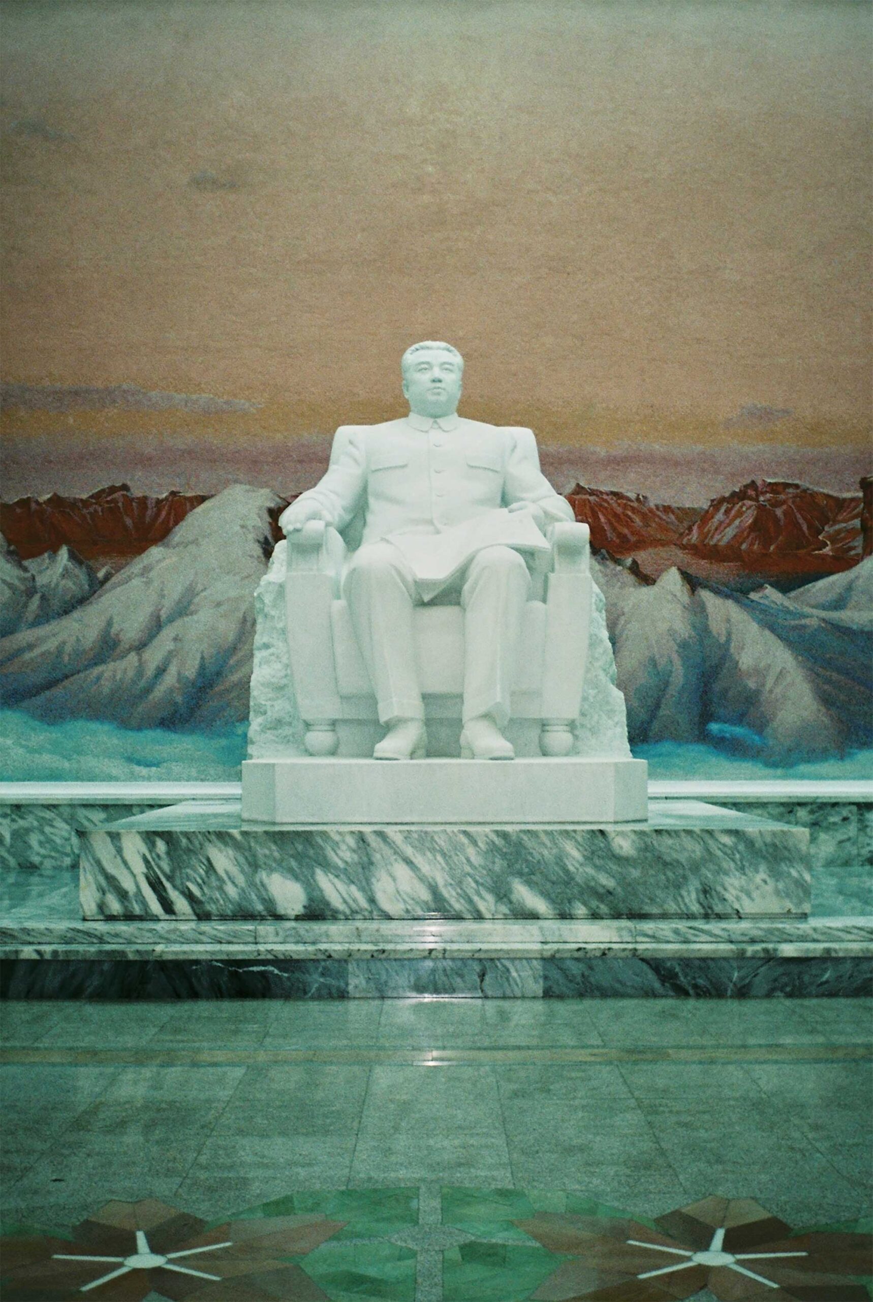 Huge monument in the National Library of Pyongyang, North Korea, featuring Korean leader Kim Il-Sung carved from stone seated on a marble throne