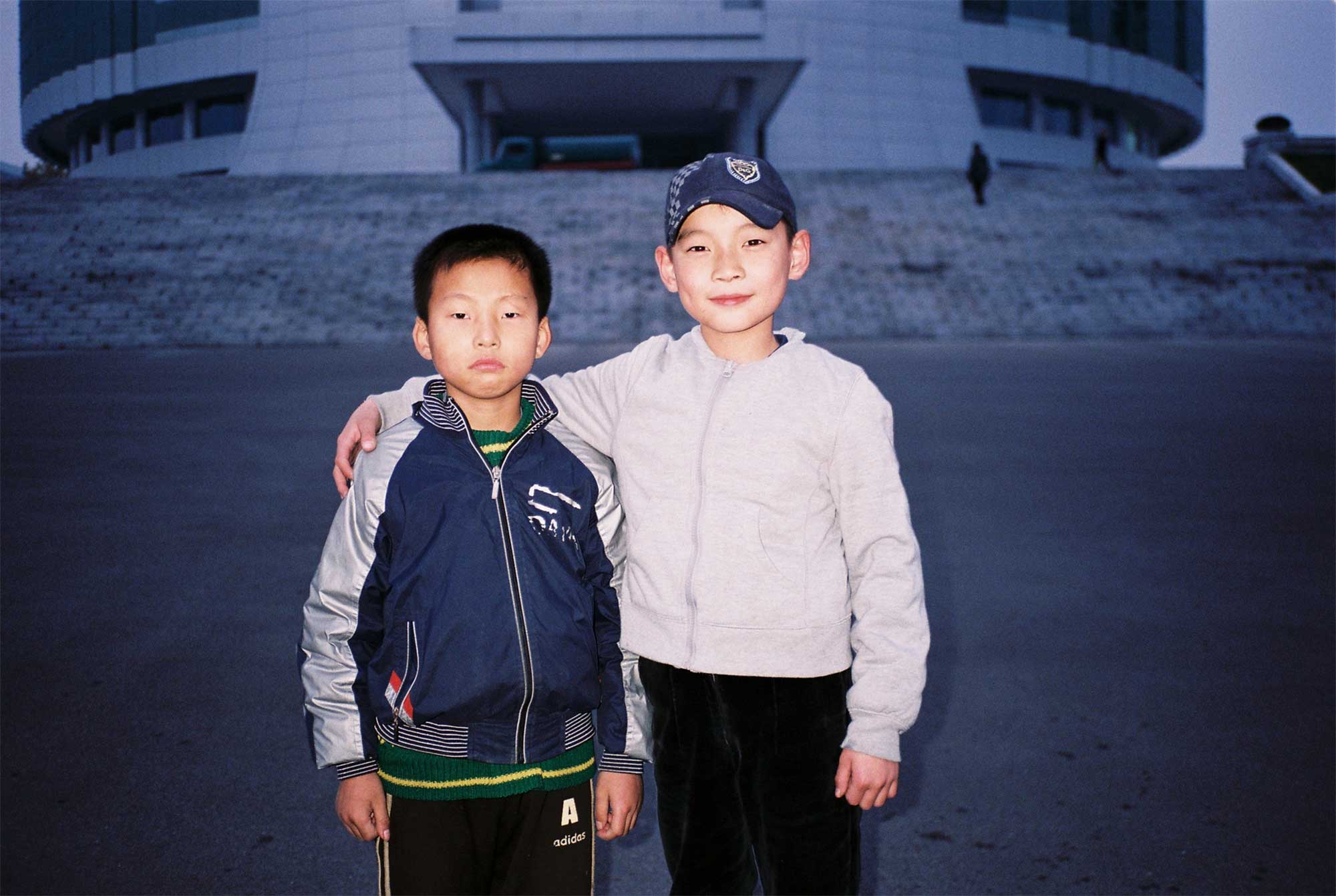 At dusk, two young children pose in front of a concert hall in Pyongyang, North Korea, for this portrait