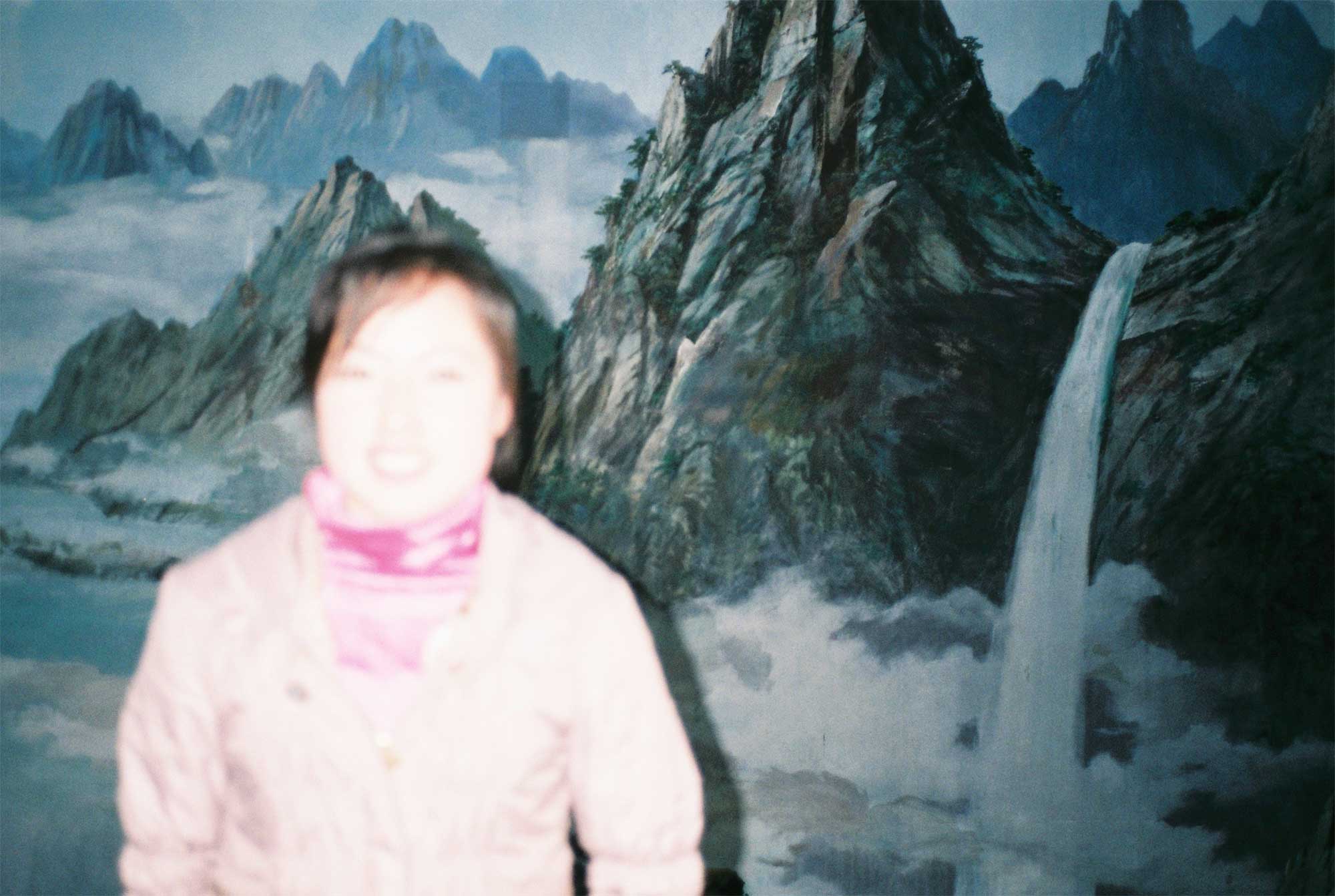 A woman in Pyongyang, North Korea, poses before an interior mural depicting a majestic mountain landscape and waterfall, with the camera focused on the waterfall