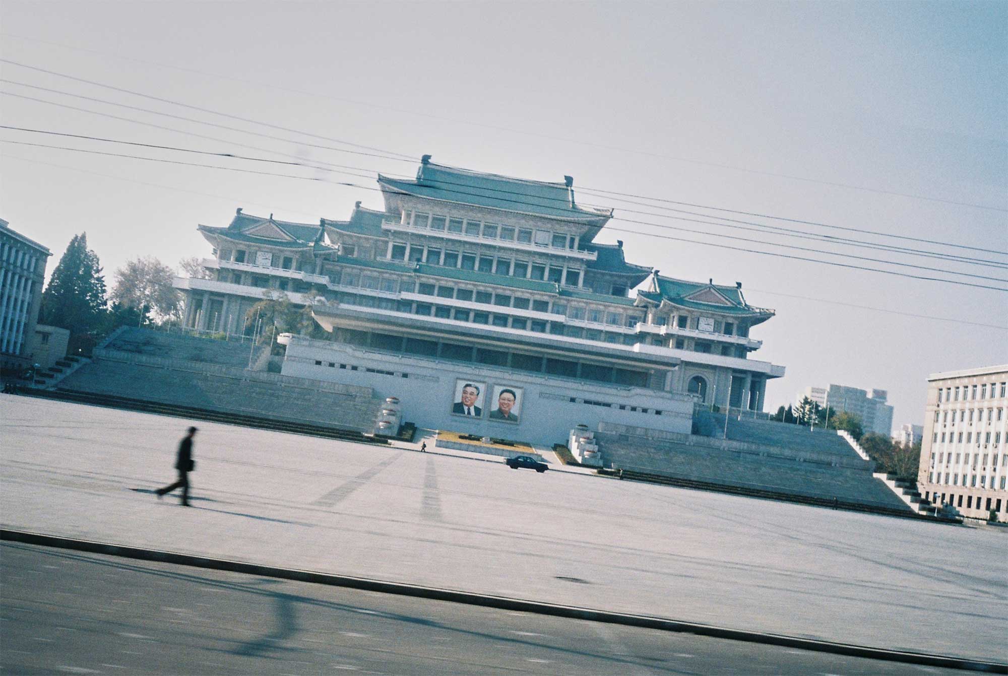 A tilted photograph captures an official government building in Pyongyang, North Korea, adorned with massive images of the late North Korean leaders Kim Jong-il and Kim Il-sung