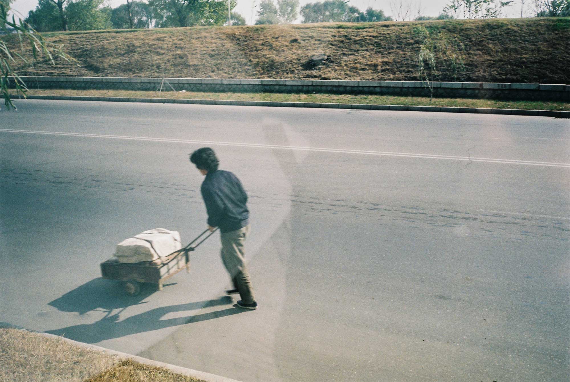Inside a bus, a snapshot captures a man pushing a heavy cart on a Pyongyang street