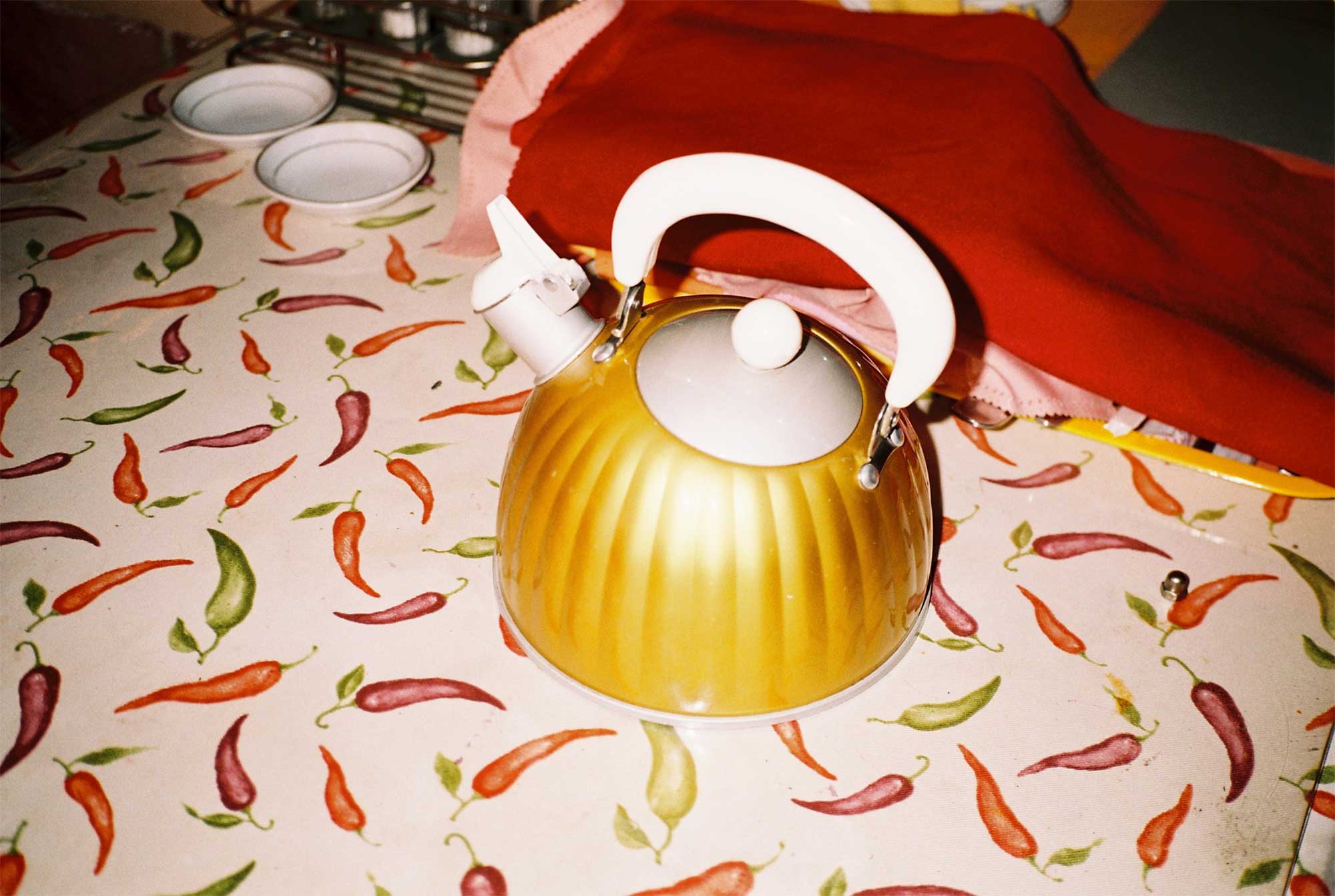 A golden tea pot sits on a platform adorned with a chili pattern design in Pyongyang, North Korea