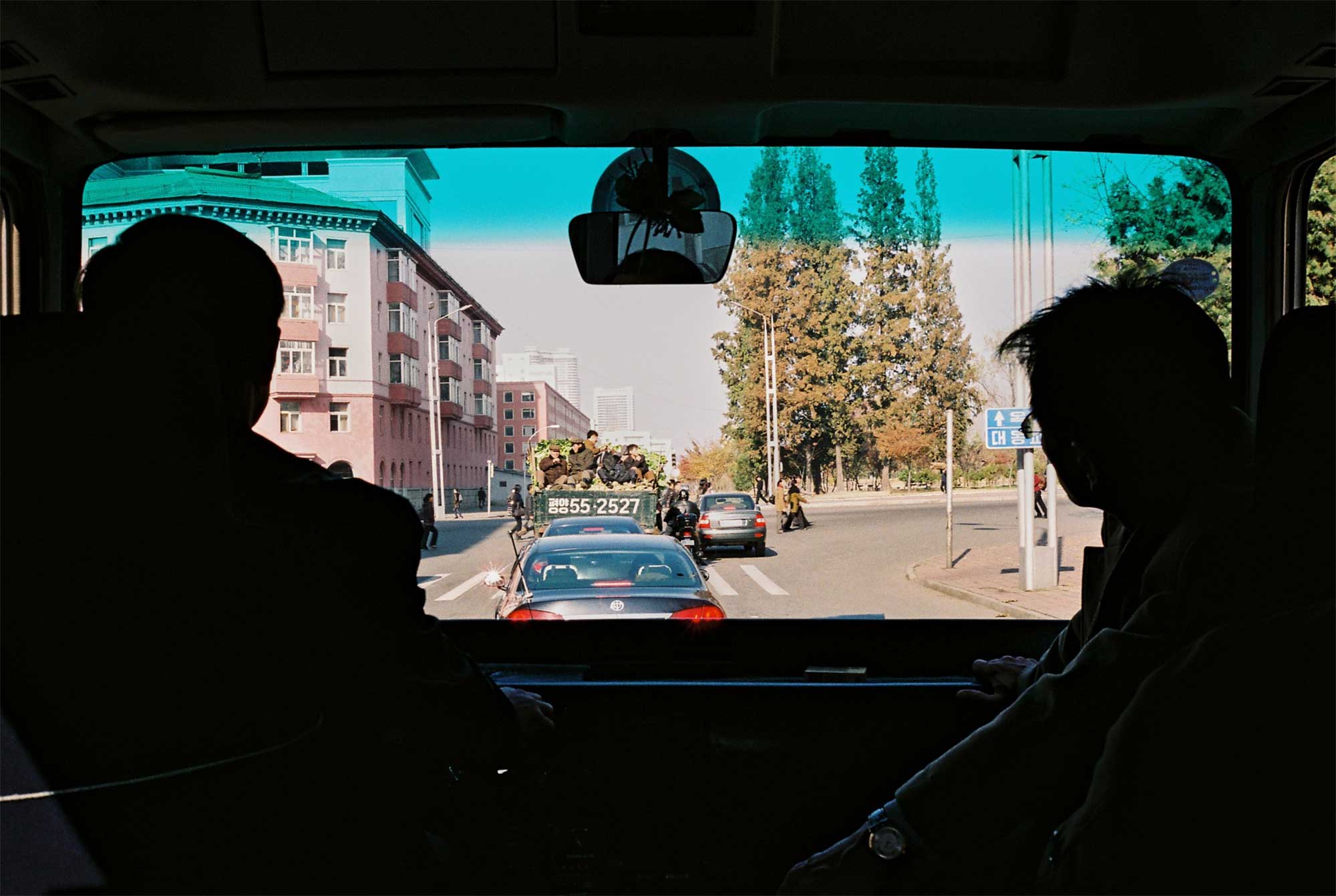 In a silhouette shot, the bus driver and tour guide sit in the shotgun seat, offering a view through the front window of a street scene in Pyongyang, North Korea, with a truck loaded with cabbages and farmers atop