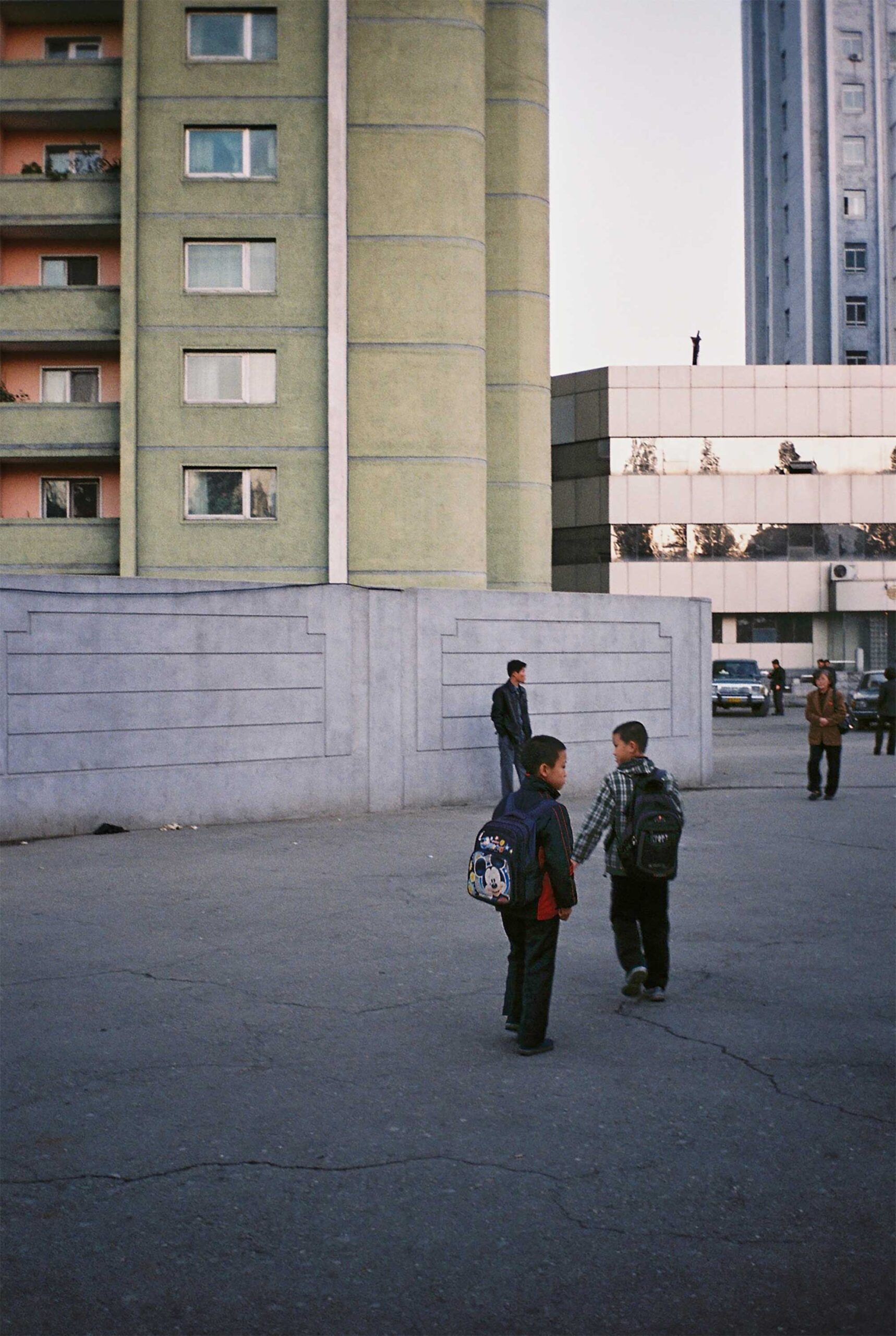 Pedestrian walk in Pyongyang, North Korea, with kids walking home from school, one carrying a backpack adorned with Mickey Mouse