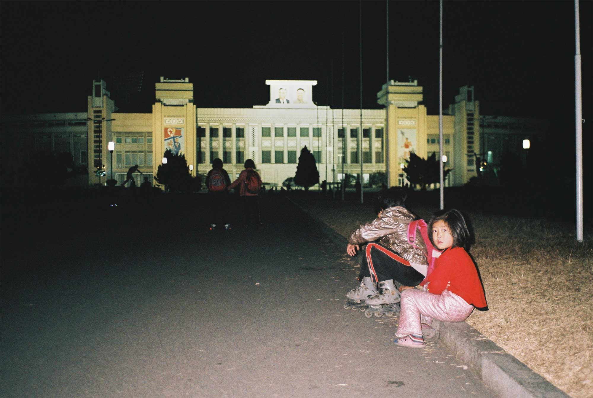 Children in Pyongyang, North Korea, play on roller blades in the dark, with a monumental building in the background adorned with images of the late Korean leaders Kim Jong-il and Kim Il-sung