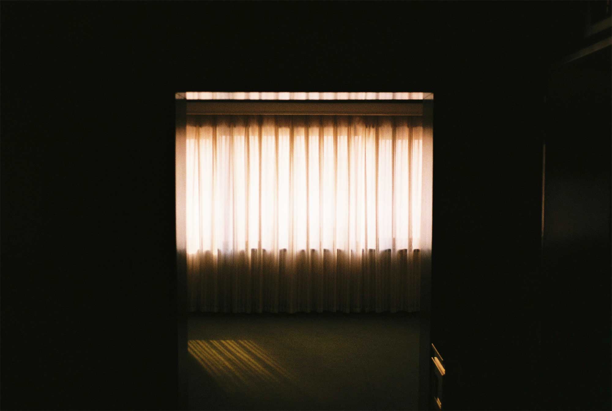 A shot of a dark hallway in Pyongyang, North Korea, with a bright sunlight backlit curtain