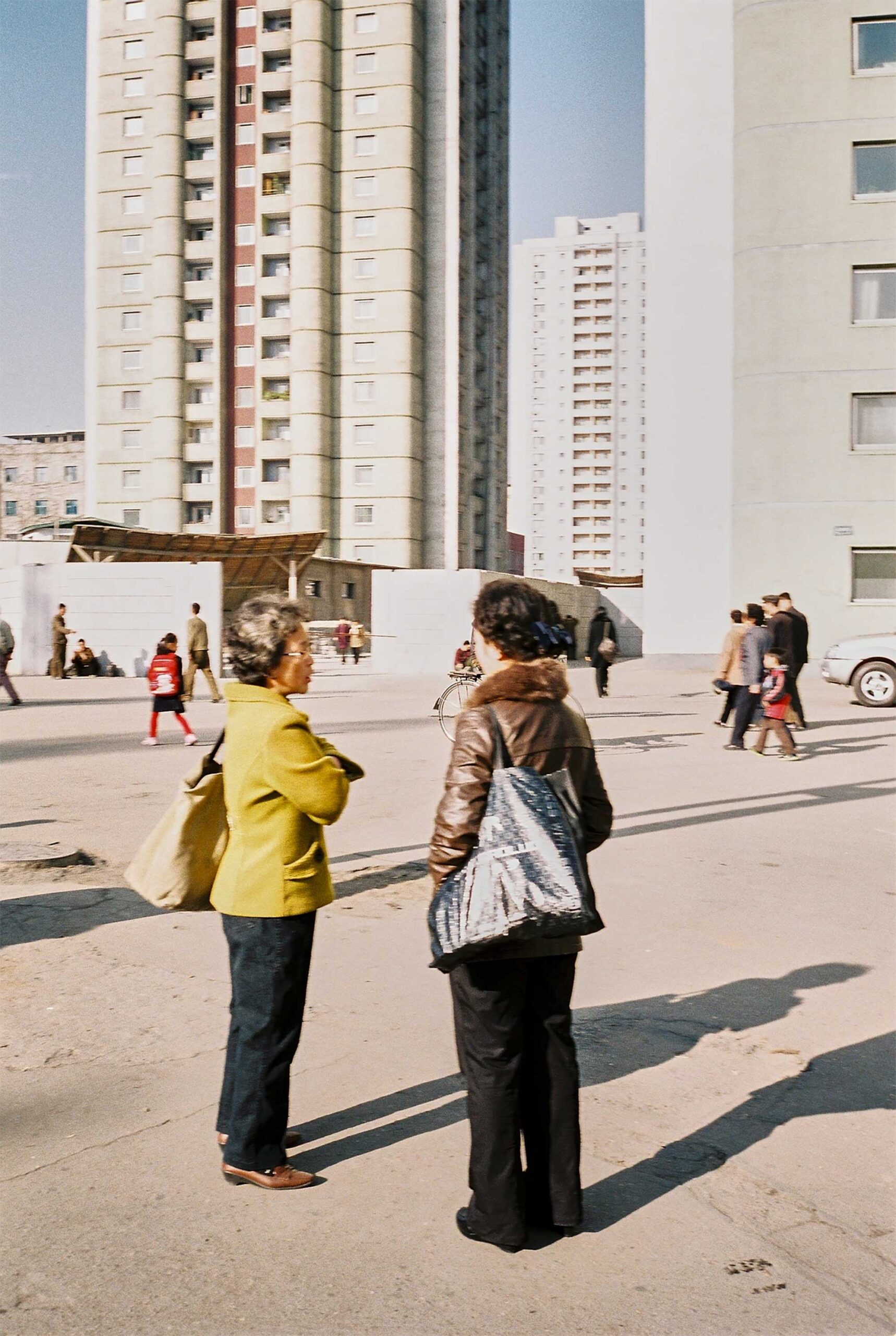Two women chatting outside a high-rise apartment building in Pyongyang, North Korea