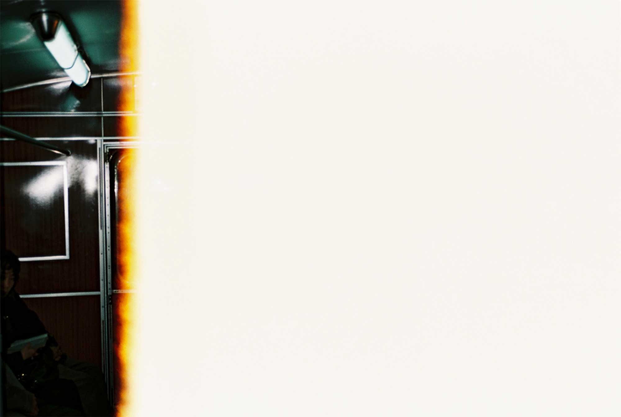 The end of a 35mm film strip, exposed to light, captured on a subway train in Pyongyang, North Korea