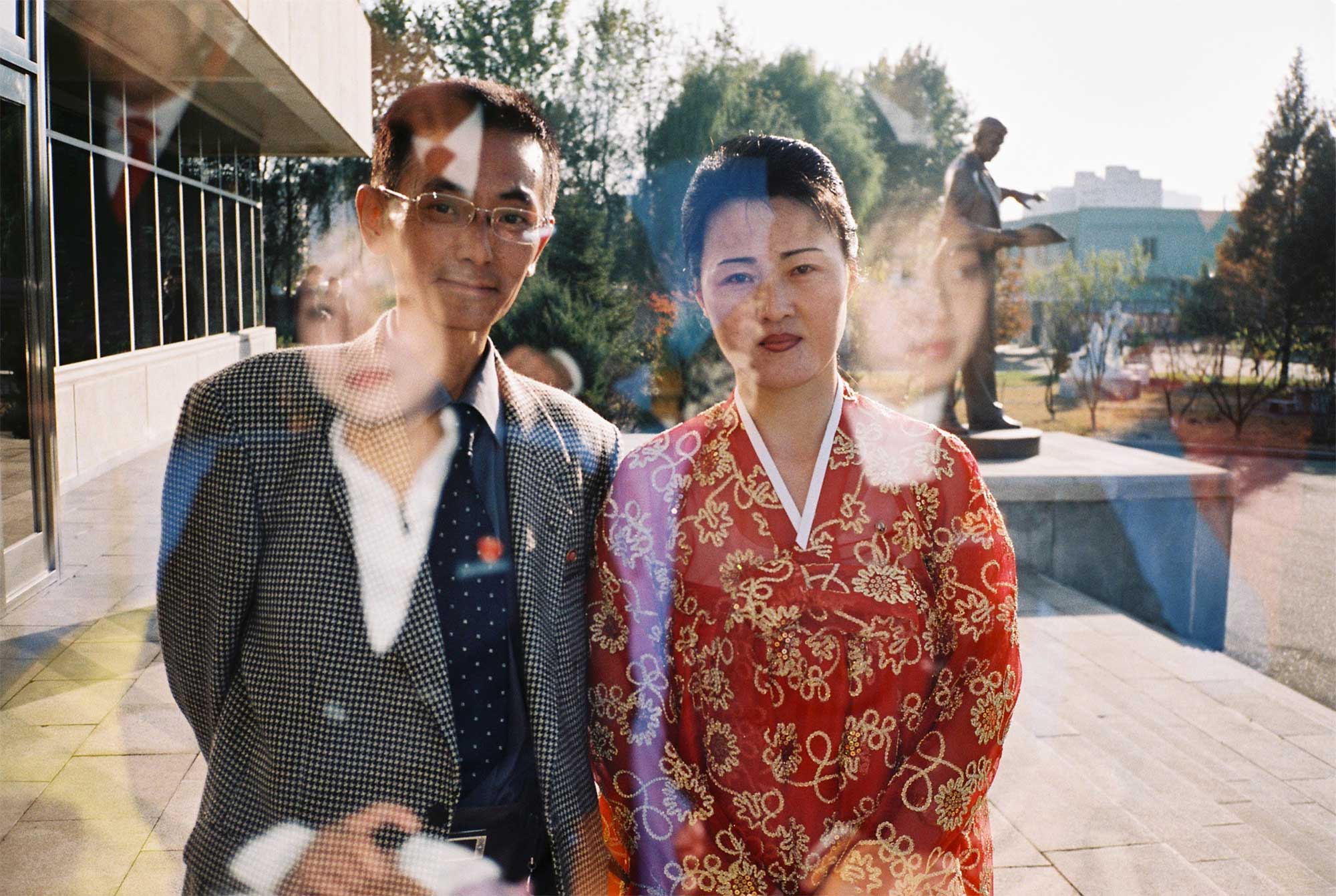 A portrait of a couple, him in a suit, her in a beautiful dress, standing outside in Pyongyang, North Korea, with a reflection overlaying two women.